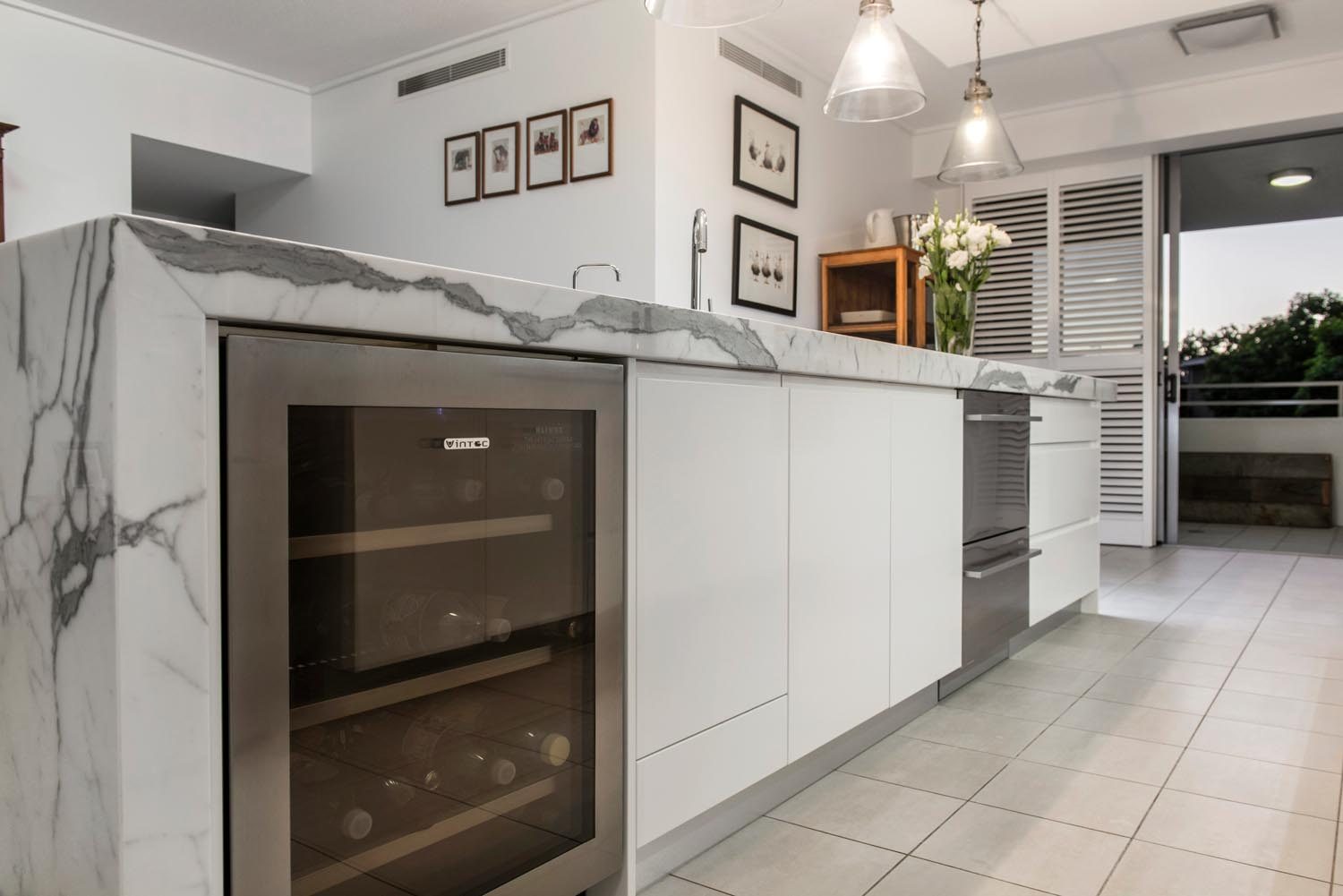 Calacatta marble benchtop against all-white cabinetry creates stunning contrast in this elegant kitchen design