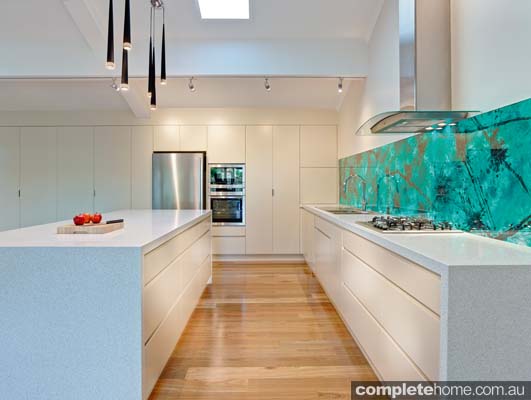 Minimal finishes combined with a streamlined design and reverse bevel finger pulls for doors and drawers are the perfect setting to show off the tropical feature splashbacks at the 4m rear bench and 2.5m island. Power is located in the appliance cabinet at the end of the rear bench and at the waterfall ends of the island for a clutter-free and functional kitchen. Spotlights and Studio Italia Yuki pendants add a final touch of drama to the pitched ceiling.”