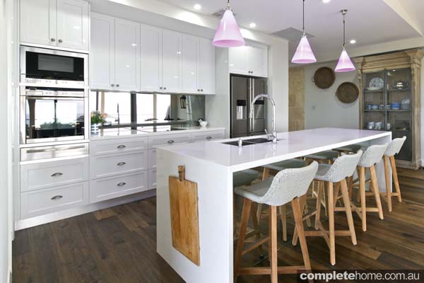 “This Shaker-style kitchen with brilliant white gloss panels and Smartstone Carrara benchtops is a stunning addition to this new family home. Set against a warm timber floor, the design is a reflection of the owners’ active lifestyle and the home’s amazing beach views. The kitchen is the perfect blend of contemporary design, paired with traditional details and functional hardware for modern convenience. The smokey mirror splashback coordinates with the Neff appliances and features strategically placed power outlets with cover plates to match. It’s the layering of details such as this and the Castella brushed-nickel cup pulls and antique fluted knobs that create individual kitchens for homeowners. We added a nook for a stool at the end of the island bench so that the owners can look out to the living area while reading a magazine or chatting over breakfast. Stone waterfall ends with mitred corners complete the crisp detailing of this vibrant kitchen.”