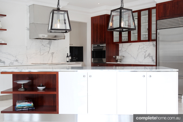 “We created a grand showpiece kitchen plus a behind-the-scenes workspace for clients who love cooking and entertaining. The fully functional butler’s pantry with extensive open shelving and preparation area is central to the design and helps cater for large functions while keeping a lot of the mess and cooking away from guests. Accessed via an open doorway in the middle of the kitchen, it has another oven, cooktop, dishwasher and sink so you essentially have two working kitchens. While a simple black and white scheme was used for the butler’s pantry, in keeping with the colour scheme of the rest of the house, the rich red of the Murray River redgum adds great warmth and texture and is a real standout feature of the main kitchen along with the luxurious Calacatta marble. We also used the timber for the floating shelves and open shelving on the island to create some interest and detail and open up the space. Rather than placing the island parallel to the back benchtop, which is typically the case, we placed it on an angle in the centre of the room, which makes the space look a lot more interesting.”