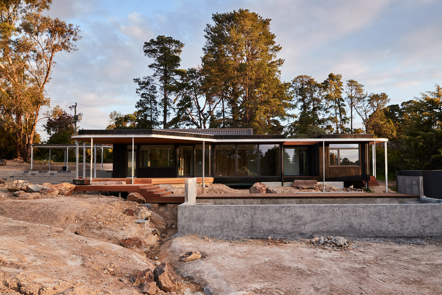 With a low-lying form, the building remains humble to its existing protected surrounding landscape of pine and gum trees. Curved timber screens soften the corners and Blackbutt Shou Sugi Ban external cladding aid to blur the line between building and bushland.