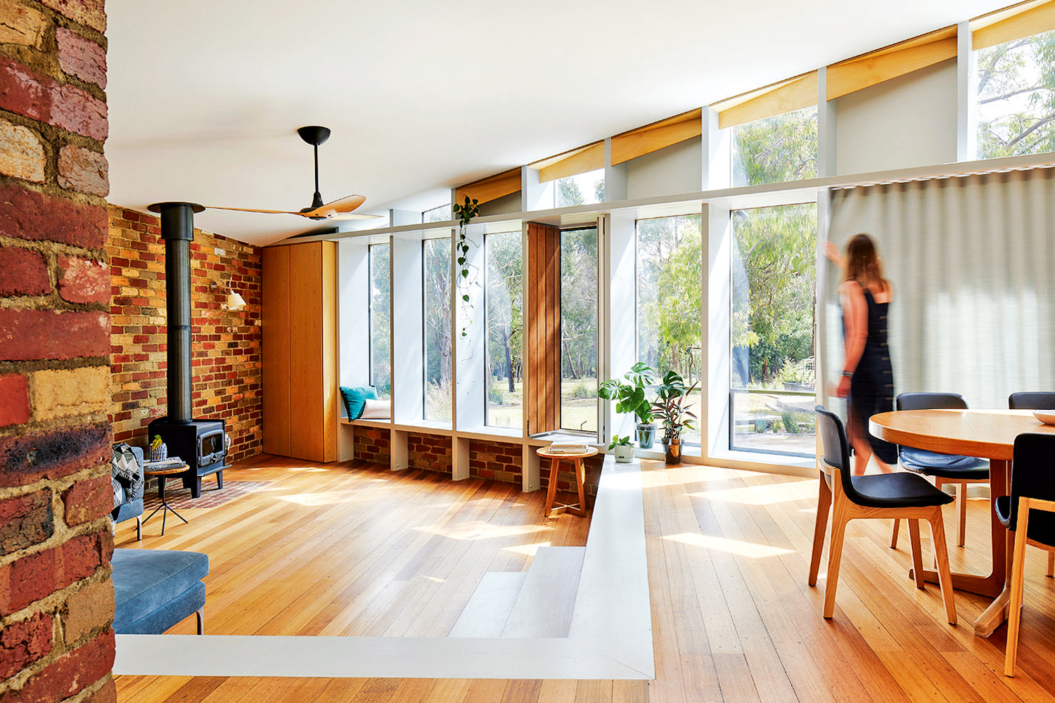 Important in the design was to create a home that could be naturally ventilated with large operable windows with flyscreens, ceiling fans and large sliding timber and glass doors to blur the division between inside and out. And in the colder months, the pot-belly fireplace warms the living areas. Here, it’s about using materials in an honest manner and enjoying being connected to this unique landscape.