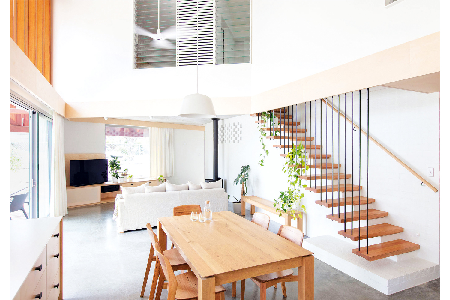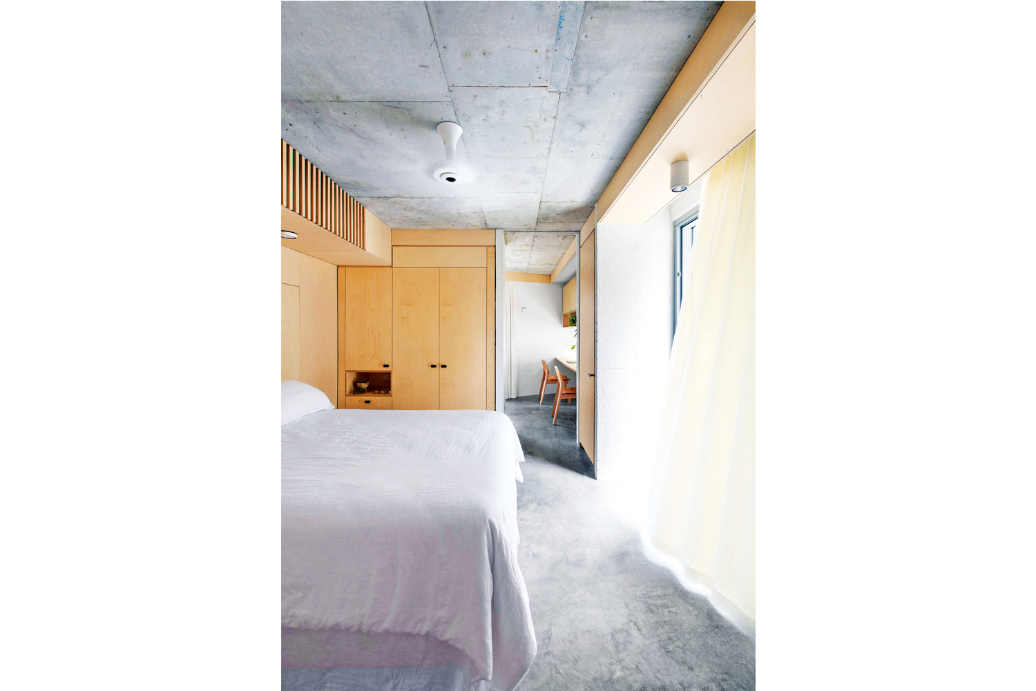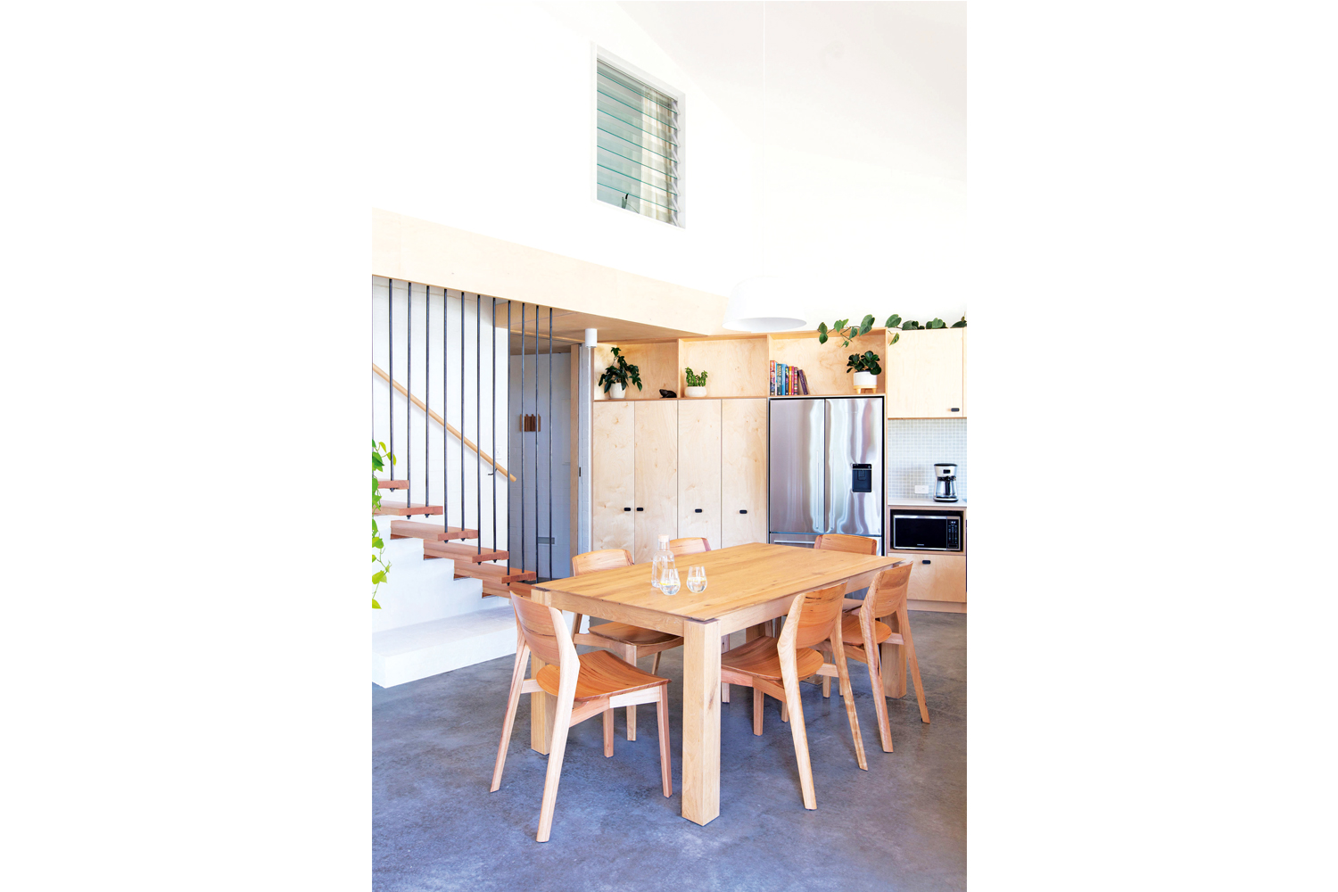 The new home consists of a generous one-bedroom apartment at ground level to address ageing in place, and two guest bedrooms plus bathroom within the roof space, akin to an attic. The standing seam cladding facade in spotted gum allows for ventilation and creates a unique design feature. The house is situated on a roundabout, so the architects created a central ridgeline to address the corner, then wrapped two sides of the building with a double-height verandah. This structure works to shade the home and also affords privacy from cafes across the road. Winter sun is allowed to penetrate deep into the plan, warming exposed concrete doors and internal brick walls that provide ample thermal mass.