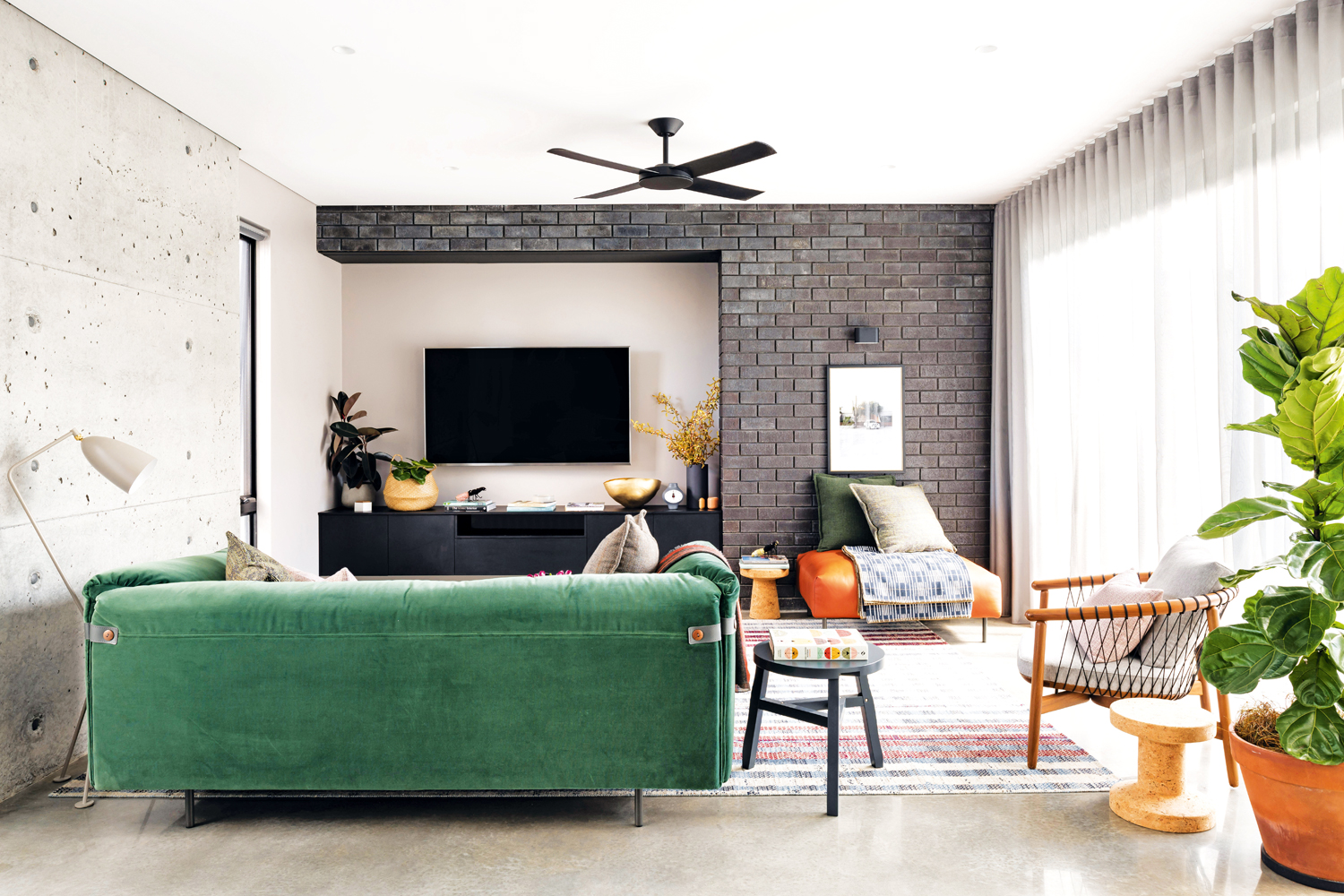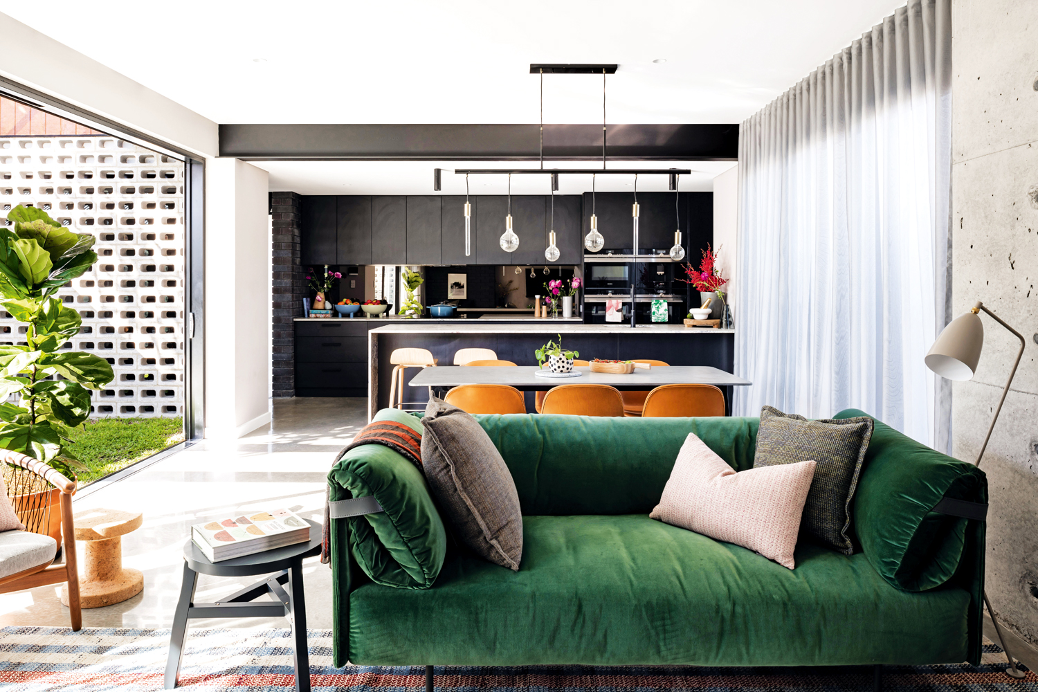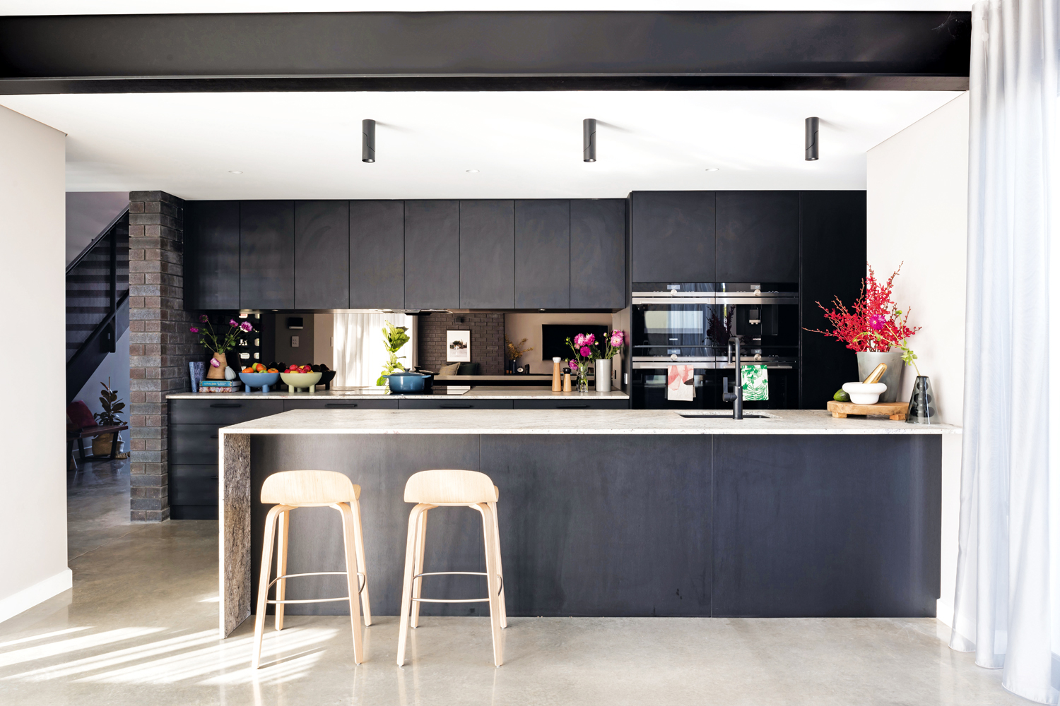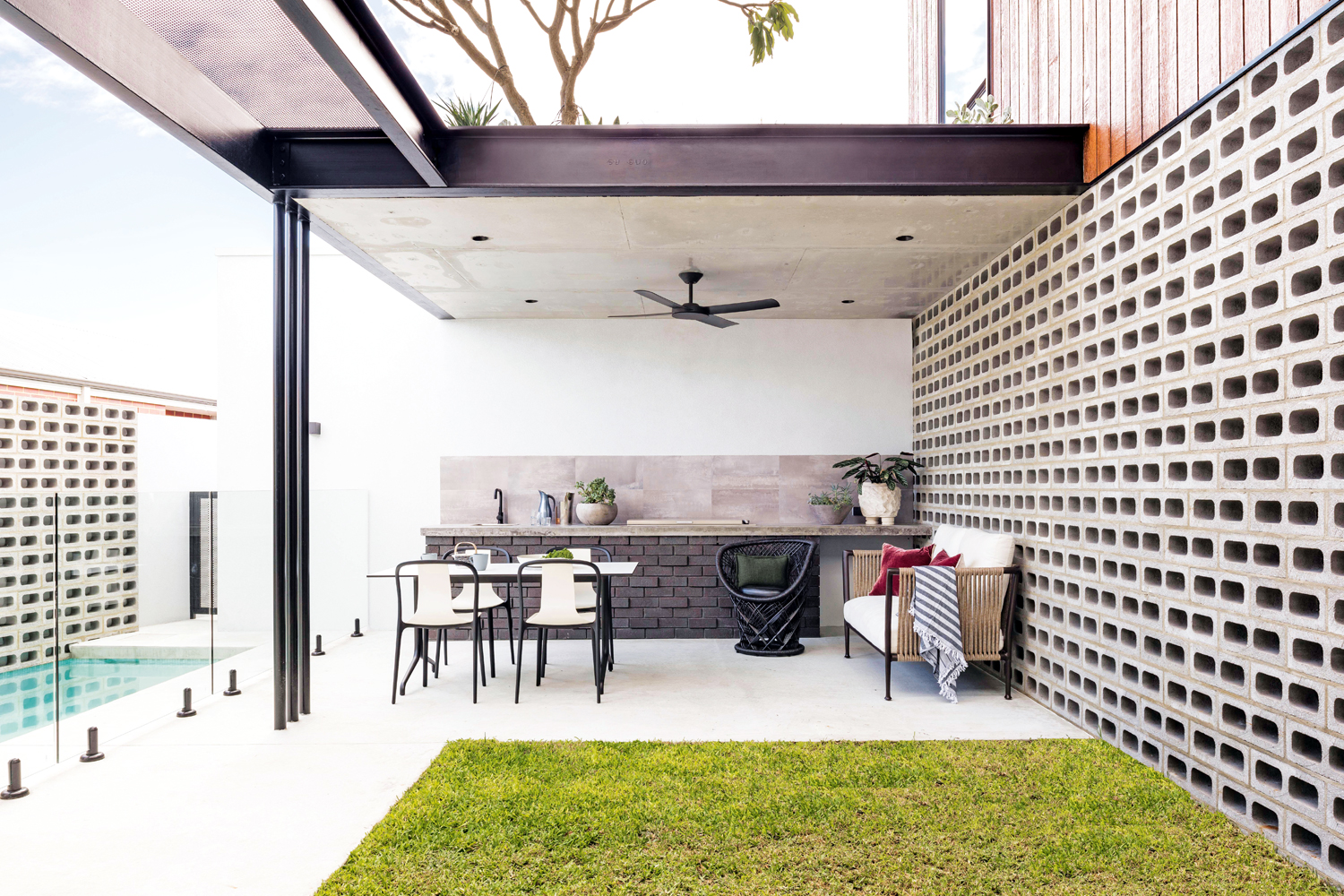 The home has been separated into two distinct zones over two floors, allowing both children and parents to have their own space and privacy as they grow. The ‘U’ shape layout for the home wraps around a central courtyard and alfresco zone, creating a cohesive indoor/outdoor connection. The material palette includes brick and block work from inside to out, as well as exposed concrete and timber to add a textural dimension to the house. A two-and-a-half-storey entry void, with north-facing clerestory windows, has been incorporated to allow natural light to flood into the central passage, brightening a traditionally dark area of the home and diffusing light throughout.