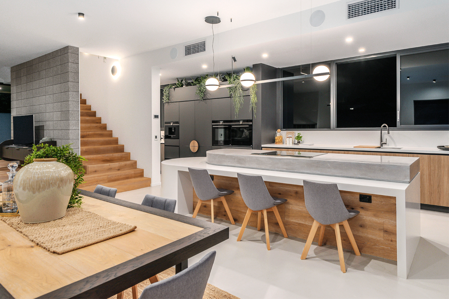 The plot was not an easy one. It was a vacant 400sqm slot with steep, sloping land rising up from a one-way street. The 10m incline from the road meant clever thinking was required to create a comfortable living space that felt both warm and liveable. Of course, the skill of building on a steep slope is finding that sweet spot between making the home feel that it is not on a steep slope at all, while also capitalising on all the best things that the elevation provides.