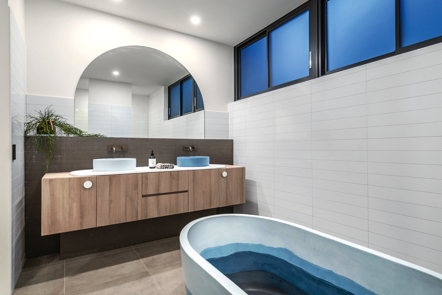 A decadent freestanding concrete bath offers a moment of privacy, encouraging ultimate relaxation. Its installation offered the homeowners yet another opportunity to conquer a challenge given its 350kg weight, requiring it to be lifted via crane from the floor above it before it could take its final resting place. As Aurelien explains, these moments make living in the dwelling sweeter. In his words, “Any bath the kids take is well earned, and the house is very special because itis very practical despite sitting on the edge of a cliff.”