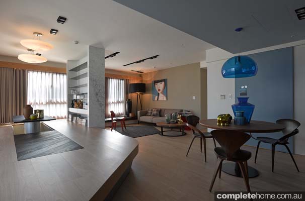 “The function of storage and display was required so the designers needed to figure out a way to combine them,” explains Shih-Jie Lin. “They came up with the idea that different glasses could satisfy this requirement. Frosted glass can remove the feeling of visual clutter and clear glass is perfect to display a collection. Meanwhile, a sapphire pendant light and round dining table were chosen to soften the visual effect created by the rectangular cabinet.”