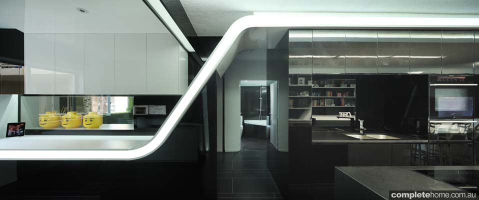 “Reflection was the primary method used to make the space look bigger,” Simone says. “We’ve used it to make the best use of natural light and capture the external views from selected locations, whether from the ‘ghost’ reflections on the walls, the ceiling bulkhead or the kitchen joinery … even the fish tank that divides the kids’ rooms and the bathroom allow for natural light to pass into the bathroom, creating a positive energy in what is a very non-conformist but relaxing bathroom.”