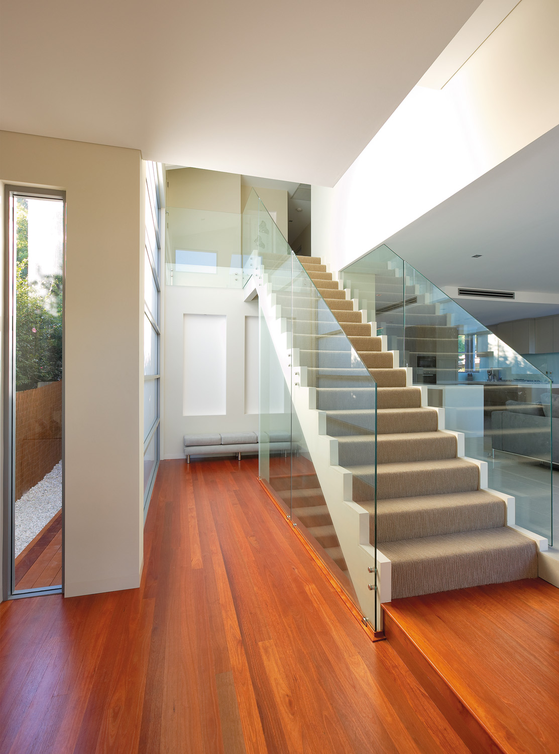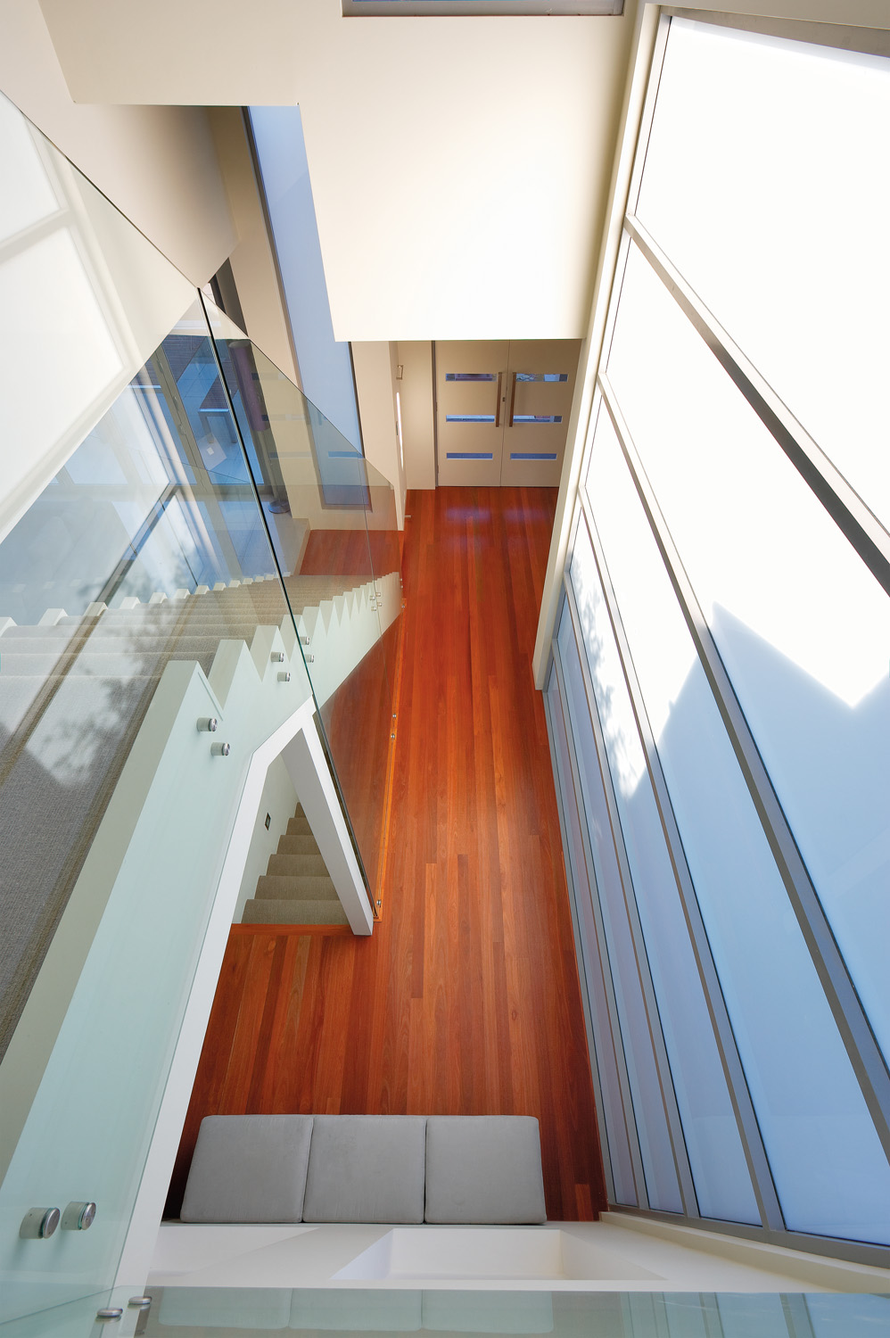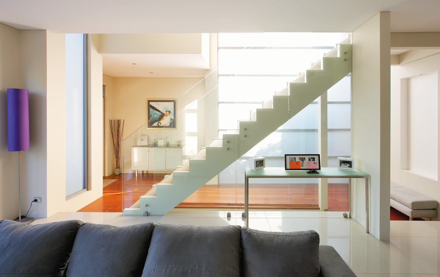 The site on which the home was built was very small and narrow so it was essential to design and build a home with large open spaces, and floor-to-ceiling glass windows and doors to create an expansive feeling. The unique design, built by Starr Constructions, needed to open up the crisp and contemporary home, which is where the floor-to-ceiling windows proved vital; they make the home seem larger. Pure-white tiles also give a sense of space and the glass staircase is a stylish way to ascend or descend, without impeding the interior view.