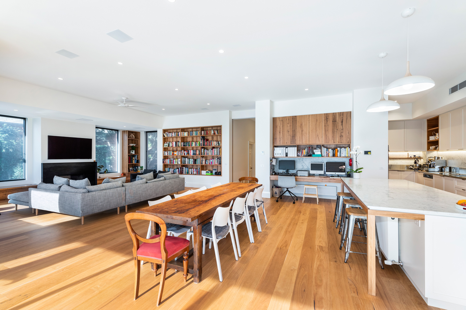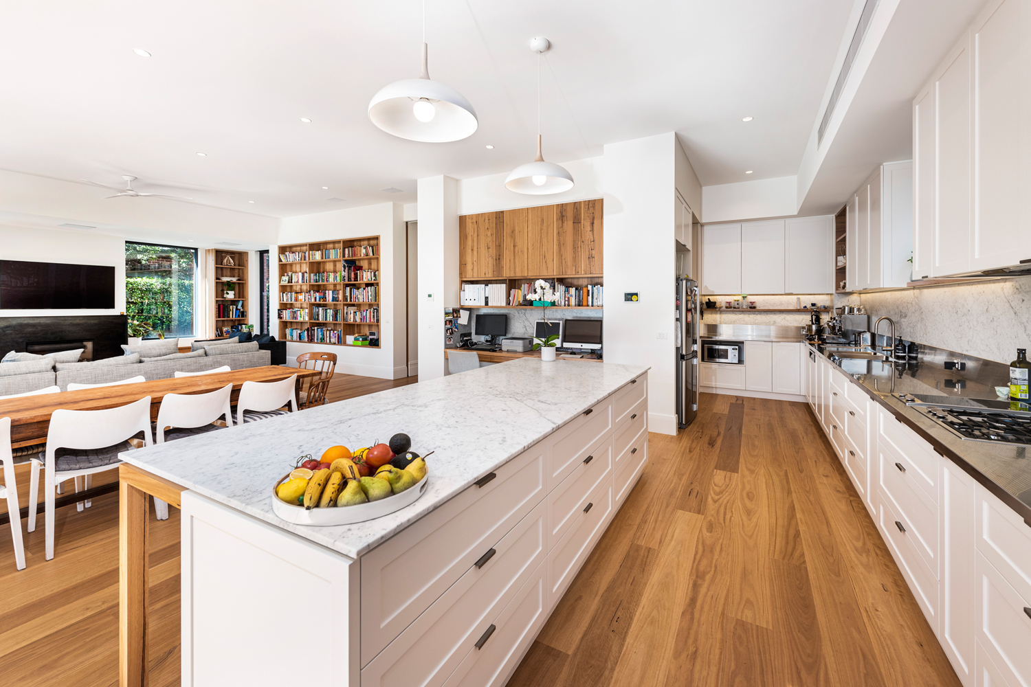 The expansive living areas are warm and inviting. In the galley-style chef’s kitchen, there is a butler’s pantry and under-bench heating on the Carrara marble island. There’s also a study nook to accommodate two large, inbuilt bookcases.
