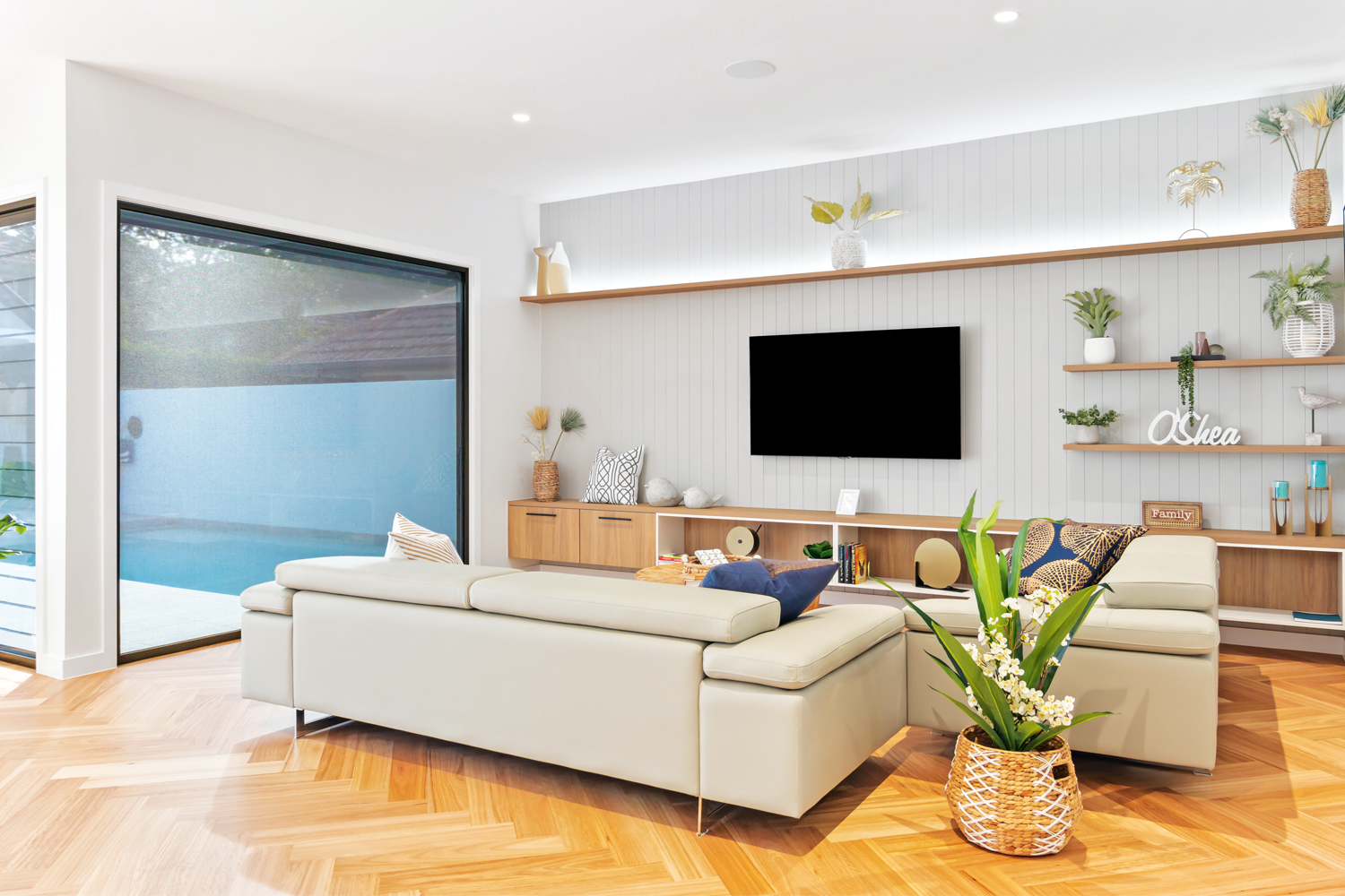 Designed and built by O’Shea and Sons, this knockdown-new-build family dwelling is the builder’s own home with plenty of space for four growing sons and the resident canine. It’s not only a family home, it’s also a business office and designer display home.