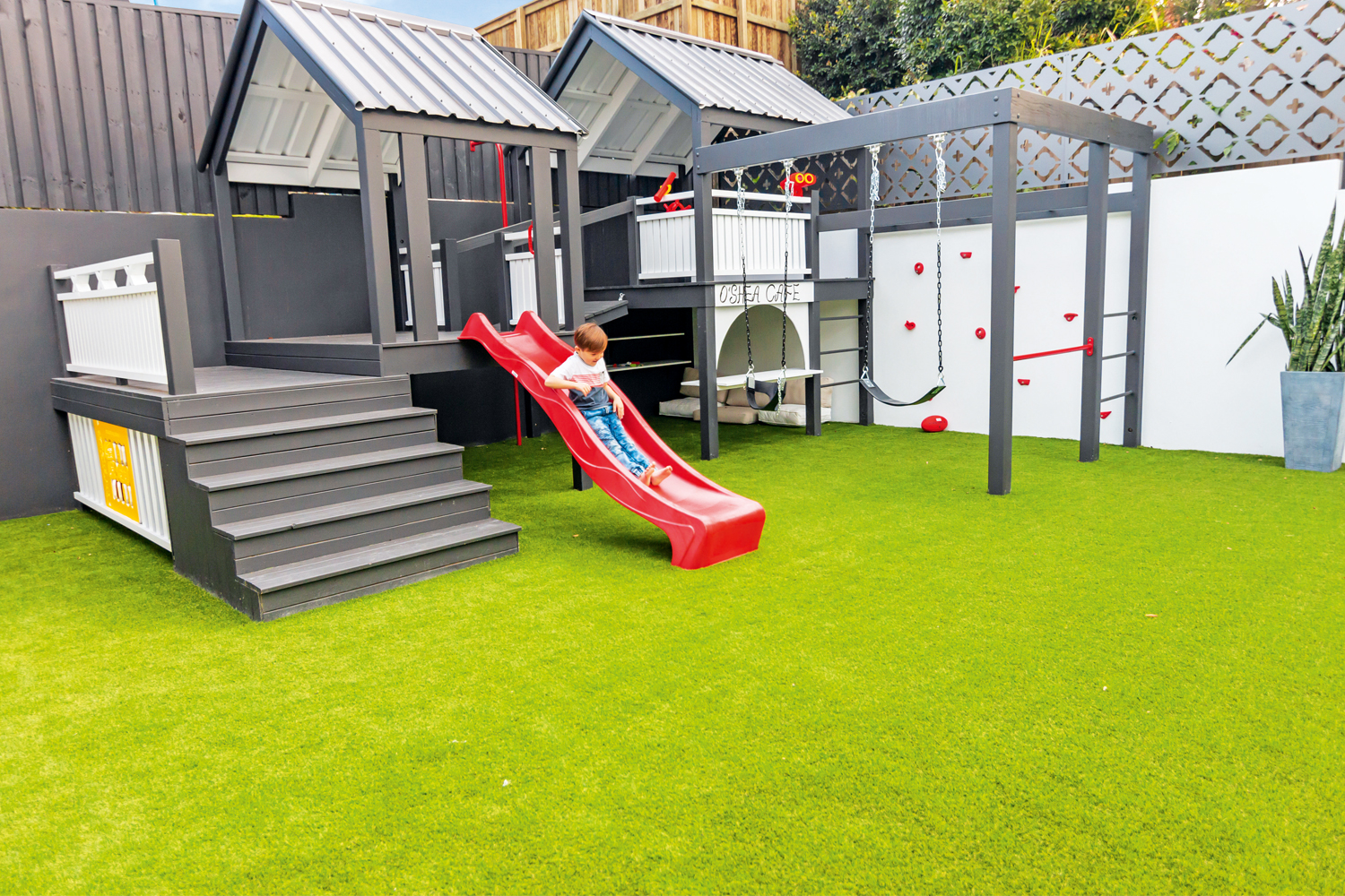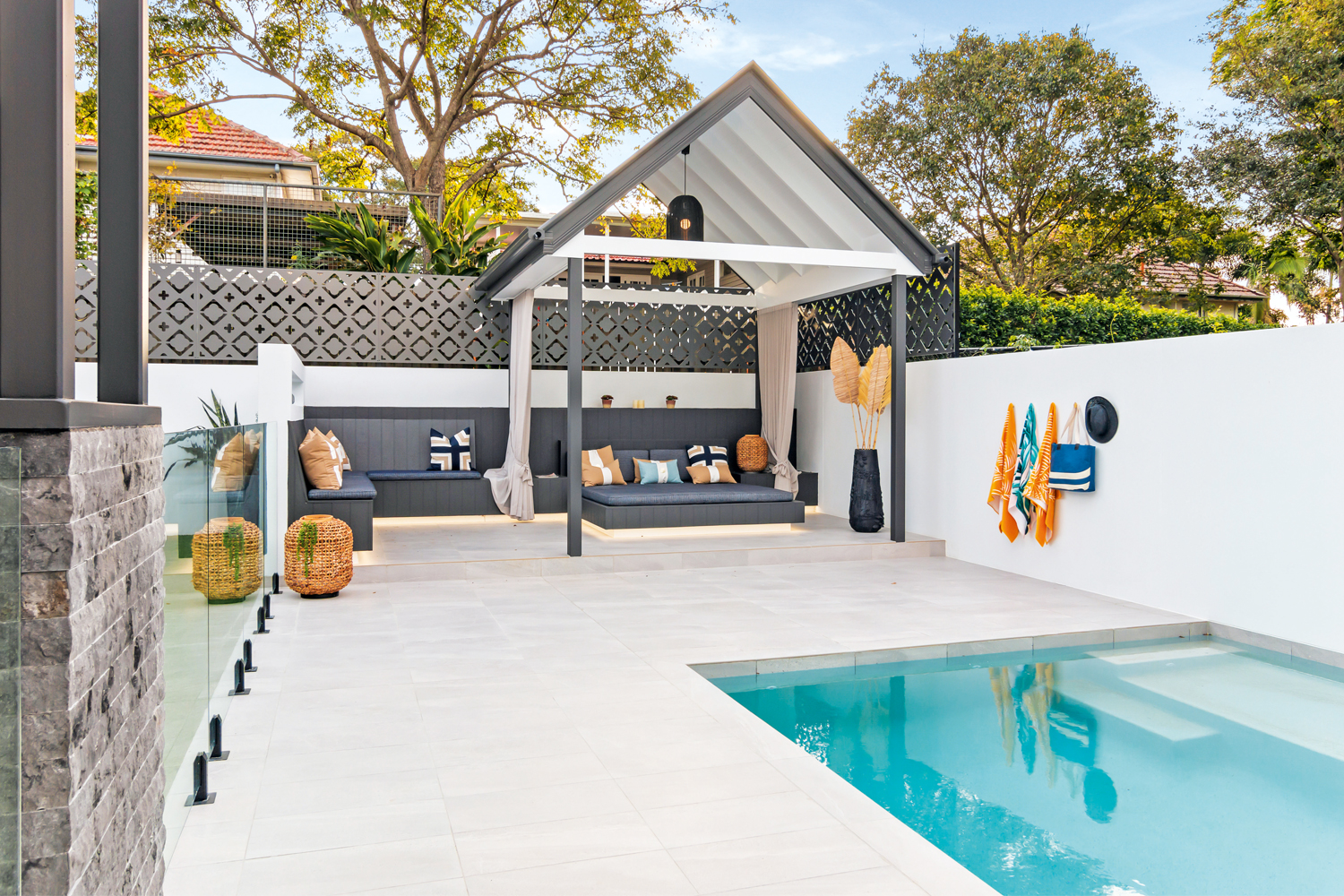 The resulting spectacular five-bedroom, four-bathroom home is three levels and has lift access to the rooftop terrace and bar along with a number of accessible features througout. These include a wine and whiskey cellar, cleverly designed in an otherwise redundant space under the stairwell, a mud room which is a casual secondary entrance to store shoes and coats, a media room and a rumpus room. Stepping outdoors, the children’s play area, a complete stunner surrounded by synethic grass from Urban Turf Solutions, plus a sparkling swimming pool by Satori Pools and a cosy cabana along with outdoor kitchen with Euro appliances, provide ample opportunities for outside entertainment and living.