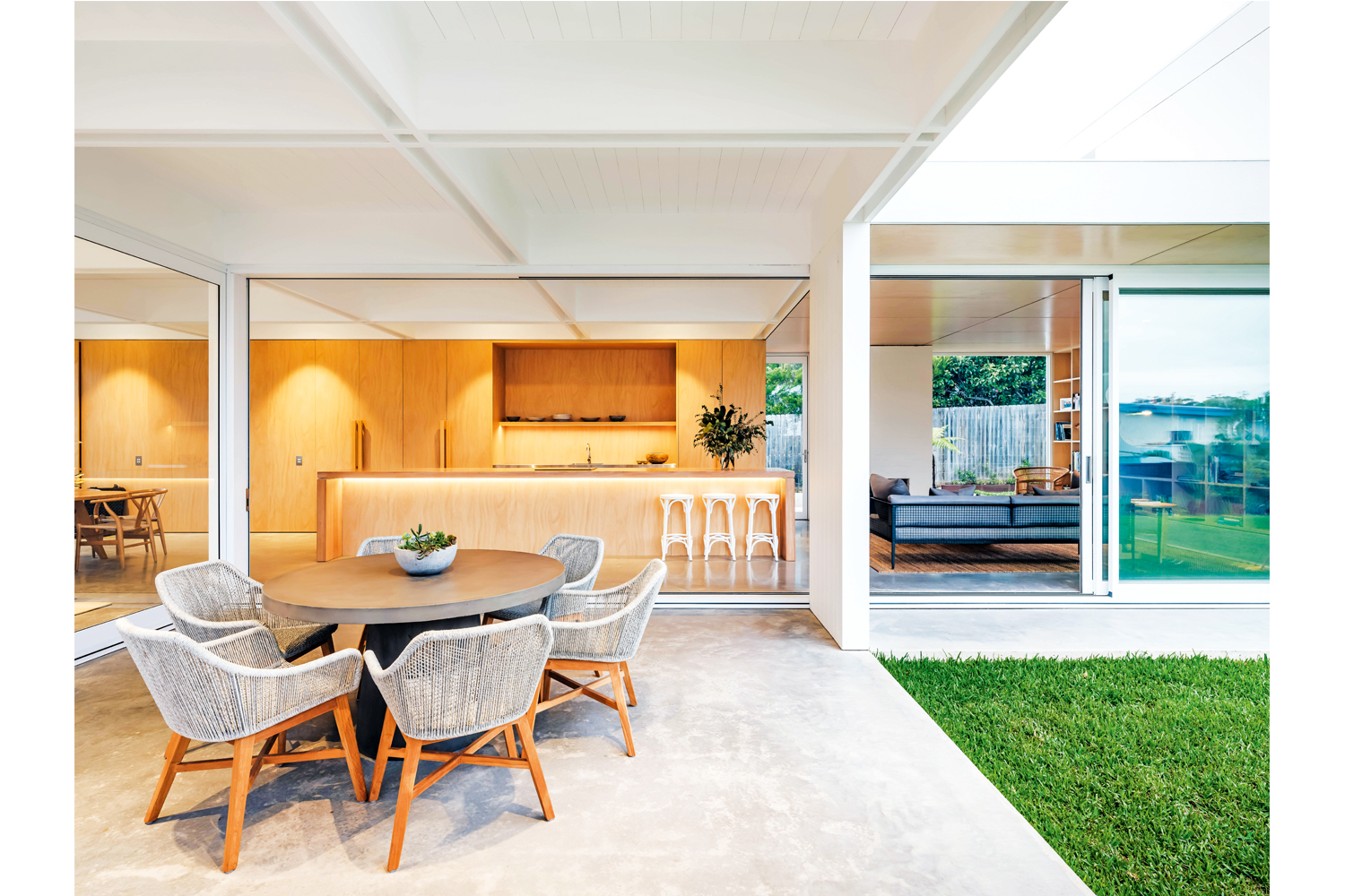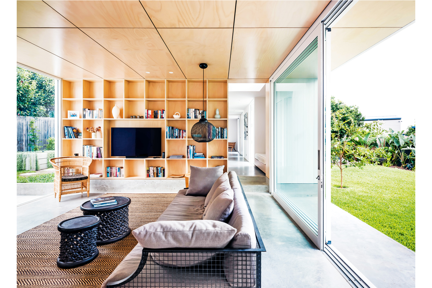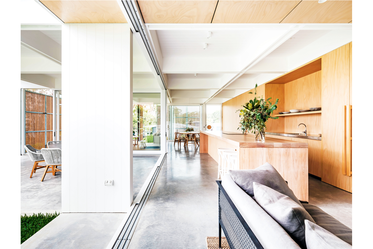 A modest, single-level living pavilion on the street side draws on the simplicity of surrounding beach houses, many of which were owner-built over the years. This also makes sure that neighbouring homes’ views are not obstructed. Operable timber screens allow for the control of privacy and when the whole house is opened up, it almost disappears, inducing the idea of camping.