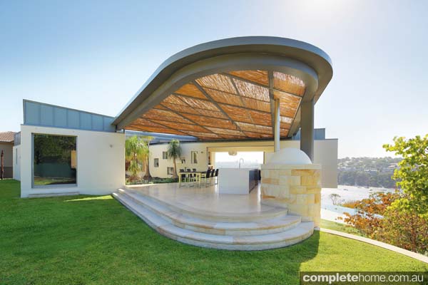The living pavilion sweeps around and frames previously unrealised views up the depth of Middle Harbour. “The home had to take full advantage of the western view towards Northbridge,” says Michael. “In addition to this view, we identified a more spectacular view up Middle Harbour. In response, the living pavilion sweeps around and shoots the eye through a picture window. To take advantage of the northern view, curving the living pavilion was the obvious solution. Importantly, it defined — and made cosy — the western balcony, preventing it from being a long, narrow and oversized one. The sweeping bend also acts to amplify the west view like a fish-eye lens. The curved balcony, when the louvres are down, makes for a space that links very strongly the piano room to the living area.”