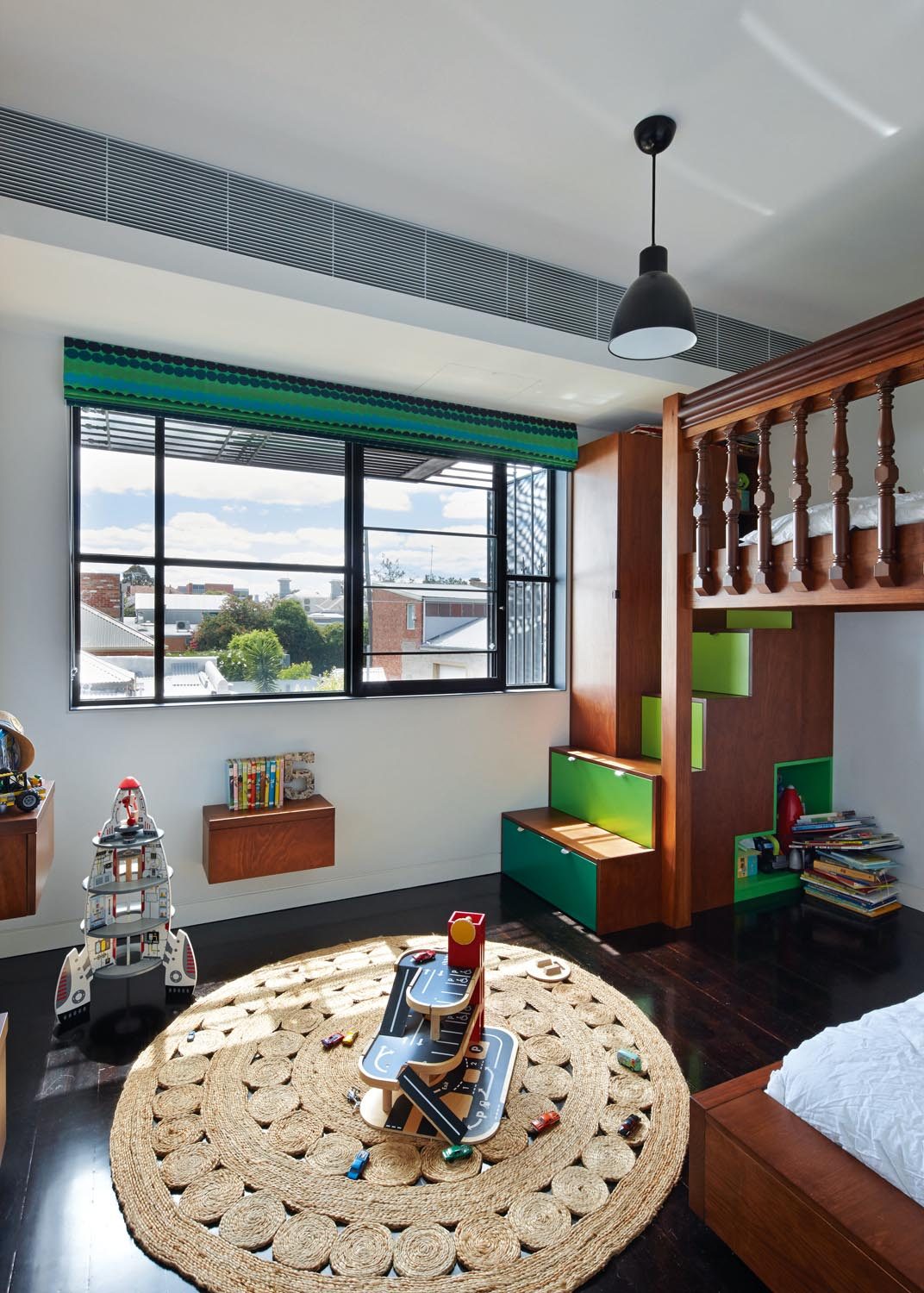 Many salvaged elements were upcycled in unexpected ways into the new building. While beautiful, the original staircase was no longer compliant or safe and wasn’t well positioned to suit the client’s desired layout. However, rather than discard it, they salvaged and upcycled it to create a striking feature chandelier, which is suspended over the new staircase and adjacent to the new recycled window wall/light well. The leftover stair balustrades were then upcycled into a loft bed with integrated storage in a new kid’s bedroom.