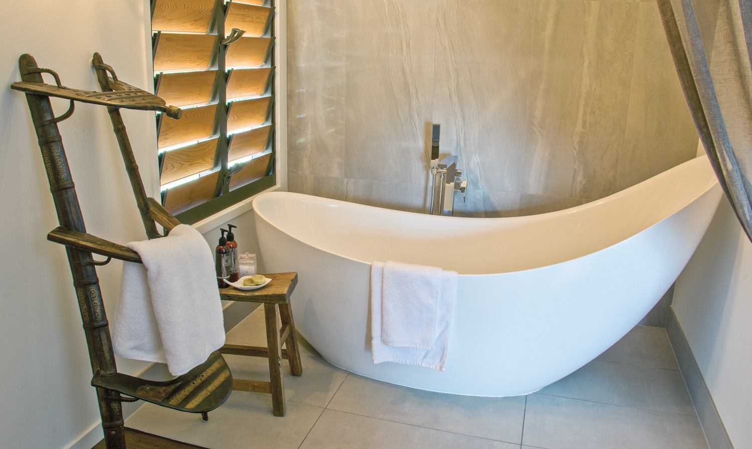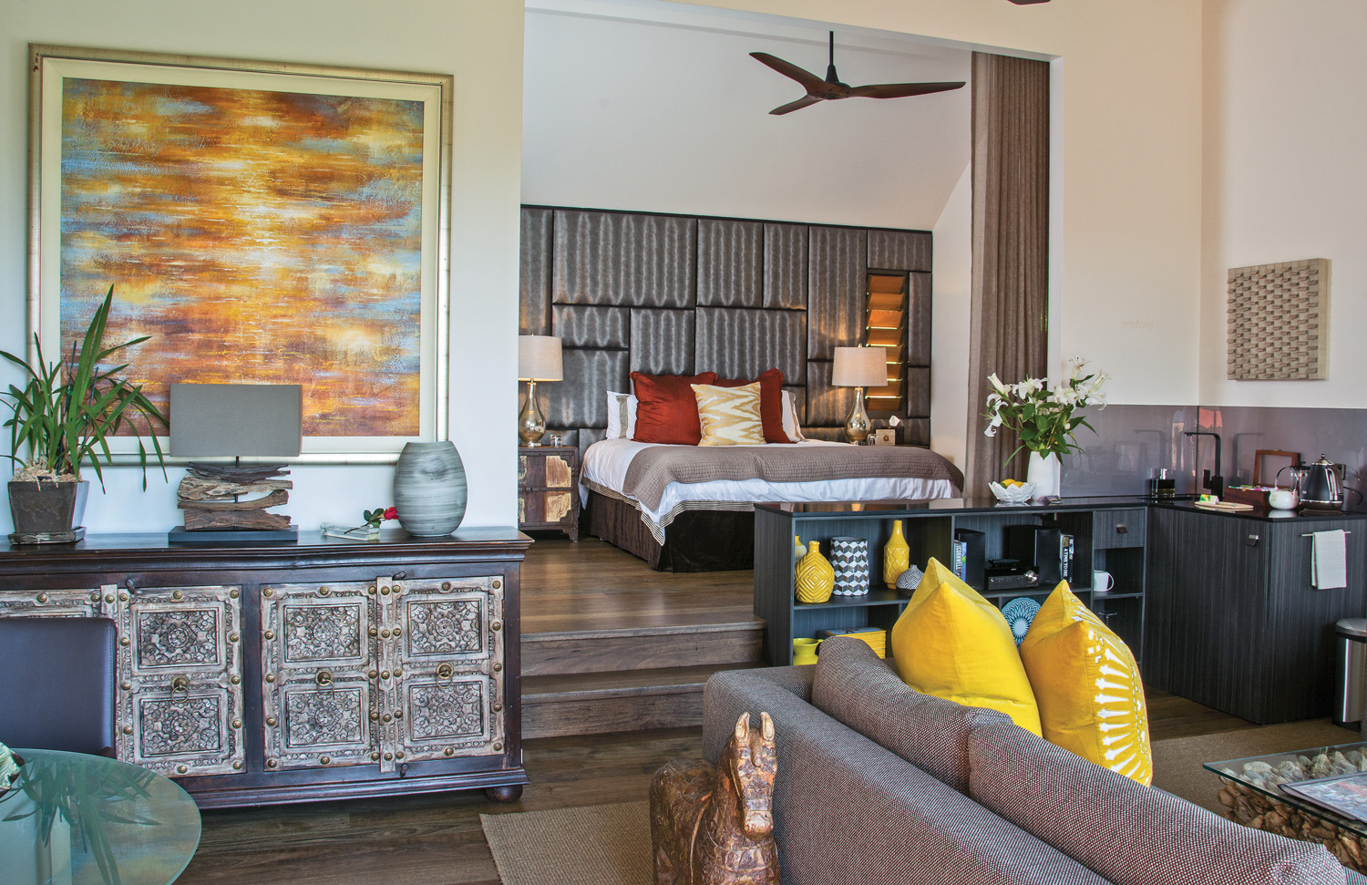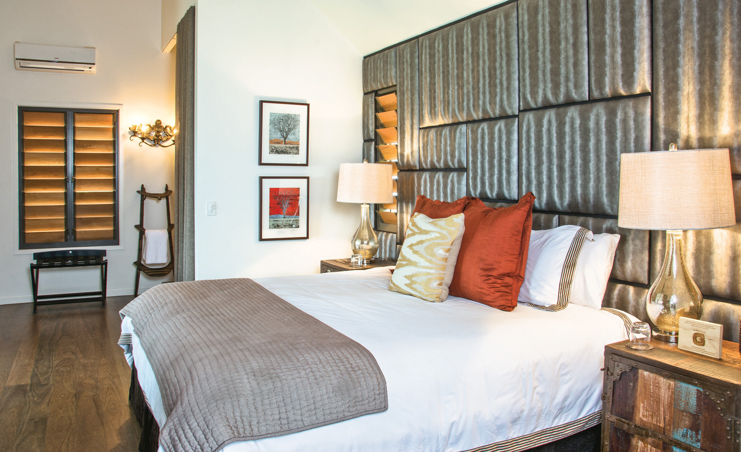 Gregg’s home is a glorious mix of collectables from his many travels and a showcase of his enviable art collection. “The design inspiration for Gaia and my home is intentionally centred on the colours of the local flora and fauna,” says Gregg. “Bringing the colours of nature in and connecting with the land is integral to our look and philosophy.” You don’t have to look too hard to see these design values in play; warm wood tones, highlights of green and earthy accents are woven throughout Gaia. Gregg chooses much of the signature soft furnishings from close friend Tai Schaffler from Bandhini Designs, who is also based on the Gold Coast.