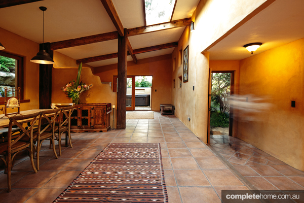 Kerry and Judi are avid collectors of history; Kerry infatuated with Native American culture and Judi interested in shipwrecked artefacts and Indigenous art. Their years of travelling have enhanced their admiration for the warmth and feel that these cultural pieces, as well as the Santa Fe adobe style of home, evoke. However, building this traditional clay house that was originally meant for the desert was a gamble in the bushy landscape of Hornsby Heights, just north of Sydney. But the couples easy-going nature and passion for difference was key to a successful and inspiring build. “We wanted something similar to a Santa Fe adobe house, something that has a nice warm feel to it, with lots of character and that is different from the norm … we wanted a house that was a creation and not just a normal building,” says Judi.