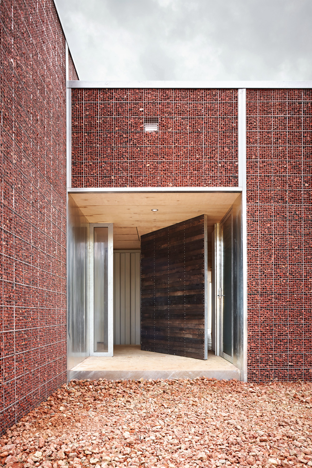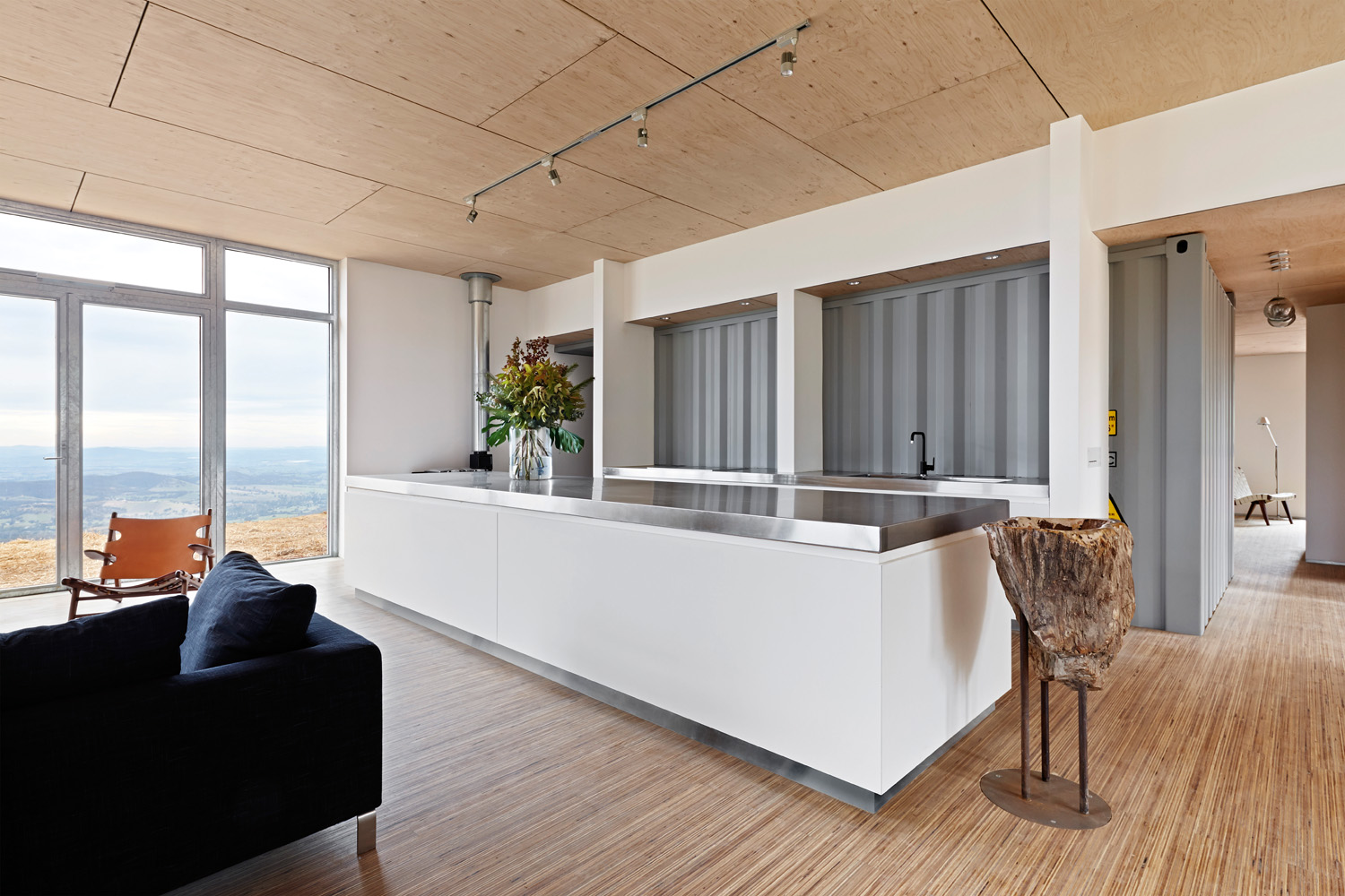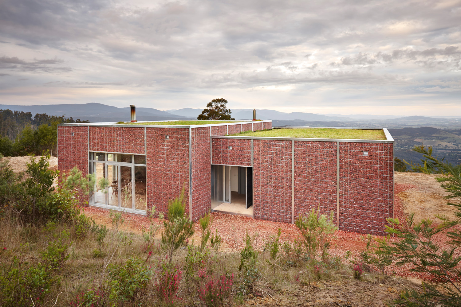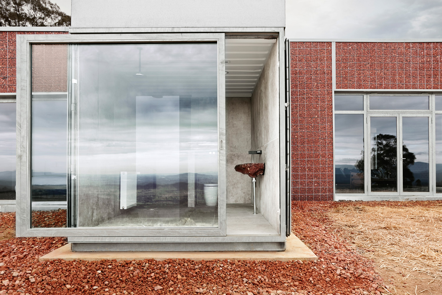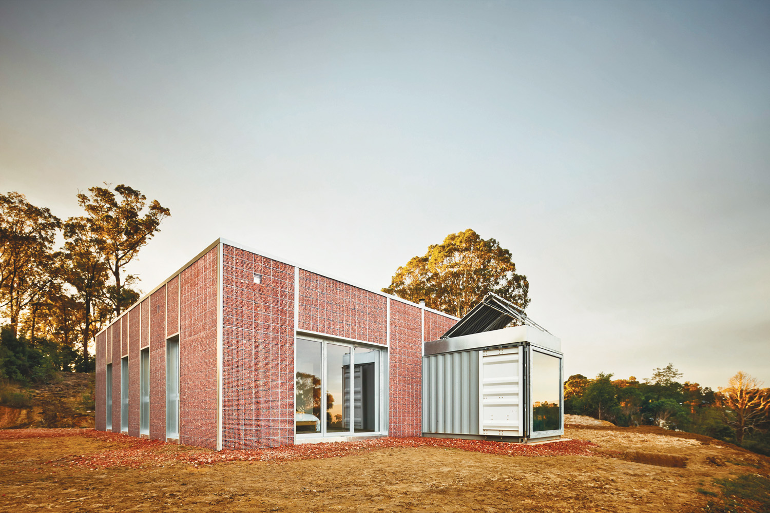 Comprising several, complex layers, the build began with pouring concrete over hundreds of small plastic dome-shaped stools “laid out in rows as if setting up for a concert, not a concrete pour”, observes Peter Maddison. The plastic stools are an insulation technology, which captures the air in the roof and ceiling space, pumps it underneath the slab, cools it or heats it and then pumps it to the other side using a 12-volt pump/fan — leaving the home at a constant 22 degrees Celsius. A six-and-a-half-tonne shipping container was then craned onto the slab, which essentially formed the spine of the robust steel frame — the only non-eco, but recyclable, material used in the build. The walls were then packed with straw bales, covered in galvanised steel, topped off with non-flammable magnesium oxide board and encased by 7 tonnes of recycled crushed red bricks in a steel mesh cage. “The house is completely made of recyclable products and is a zero-waste house,” says Dan. “It’s really important it’s a house that’s bushfire-safe and can withstand a fire front and ember attacks.”