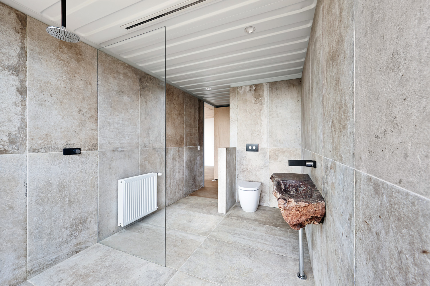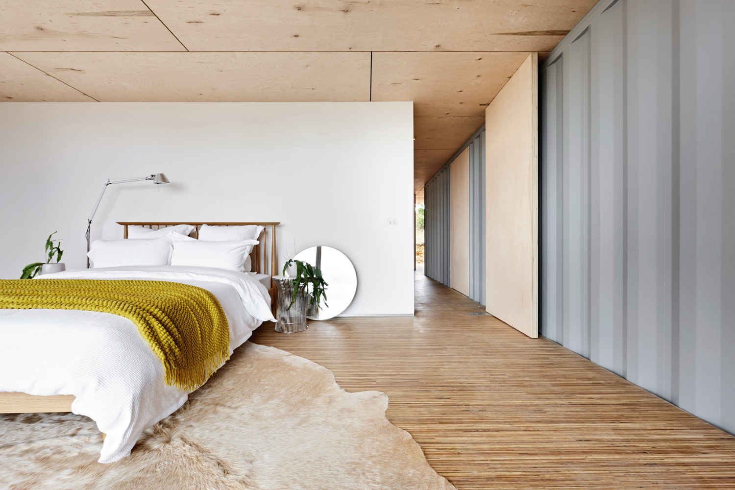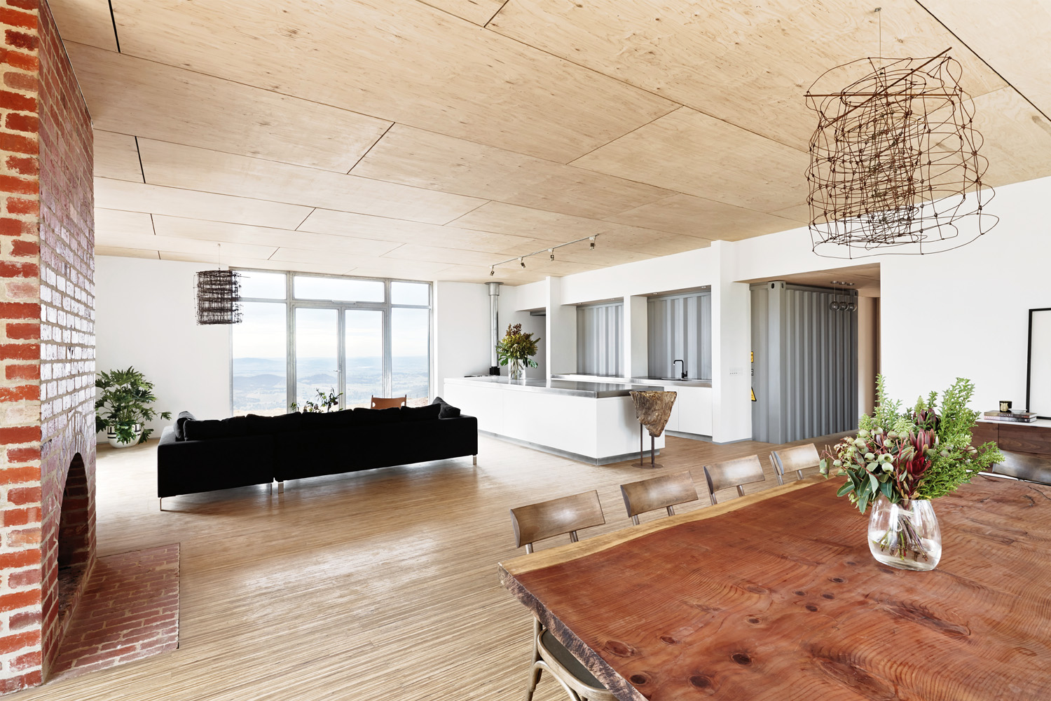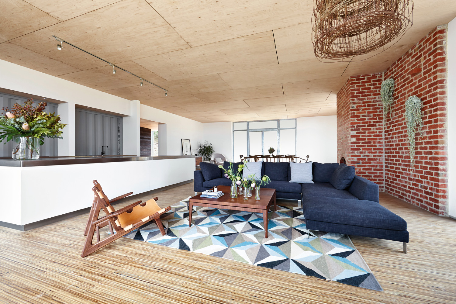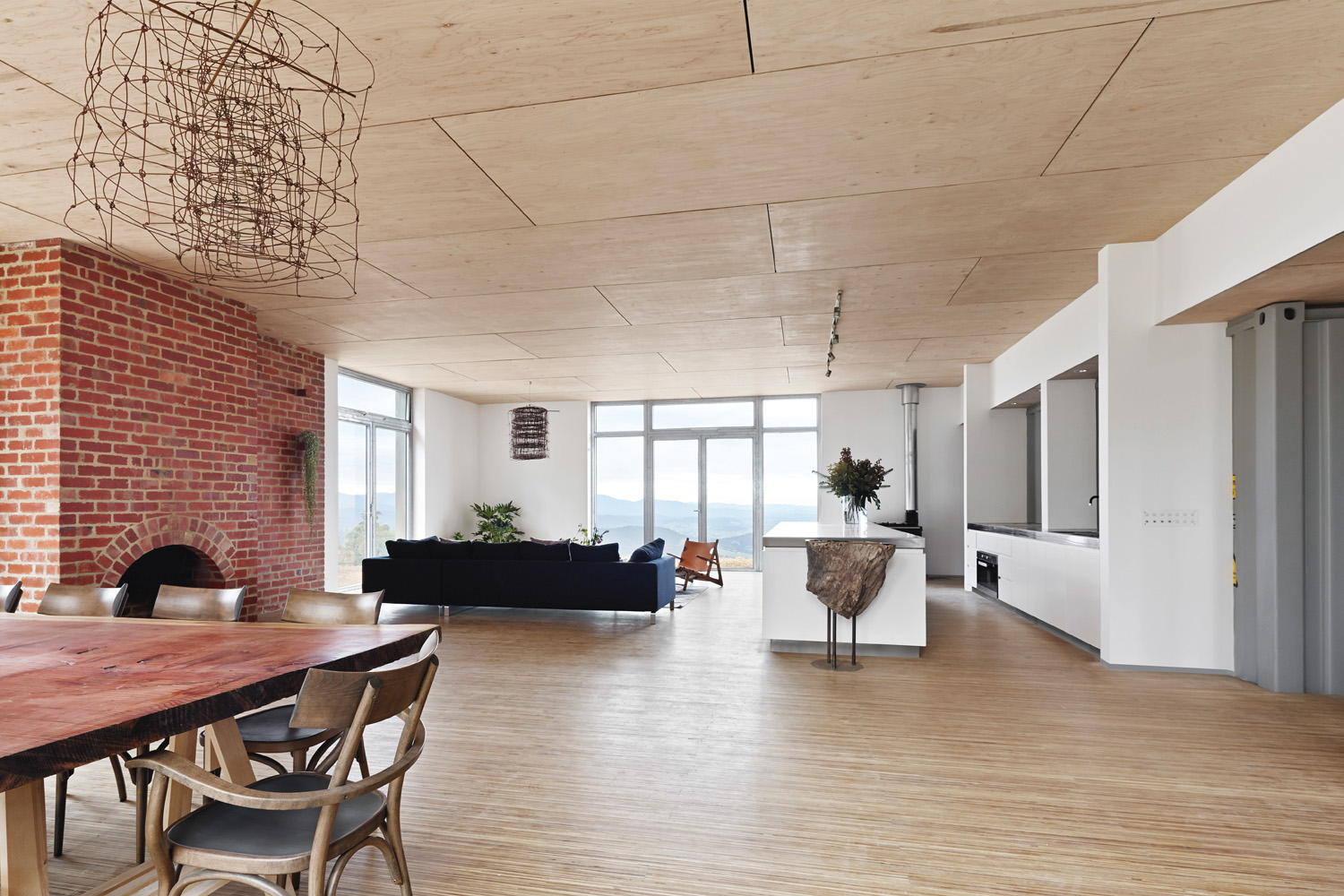 The green roof not only contributes to the aesthetics of the home, but is also functional, providing a thermal blanket that filters the couple’s only source of water on the property. To achieve this feat, a semi-trailer’s worth of polypropylene crates filled with soil were stacked on a waterproof membrane and covered in turf, providing Dan and Vicky with water straight from the source. During the build, the duo stepped outside the square when it came to the interiors of the home. Instead of opting for regular timber floorboards, they invested in eco floorboards made from plywood with soya bean adhesive lining the floors and ceilings and encasing the open living area. To inject warmth and a historic element into the home, petrified wood sourced from a junkyard was given to designer Marcos Davidson, who turned it into the artisan basin found in the bathroom — a one-of-a-kind piece.