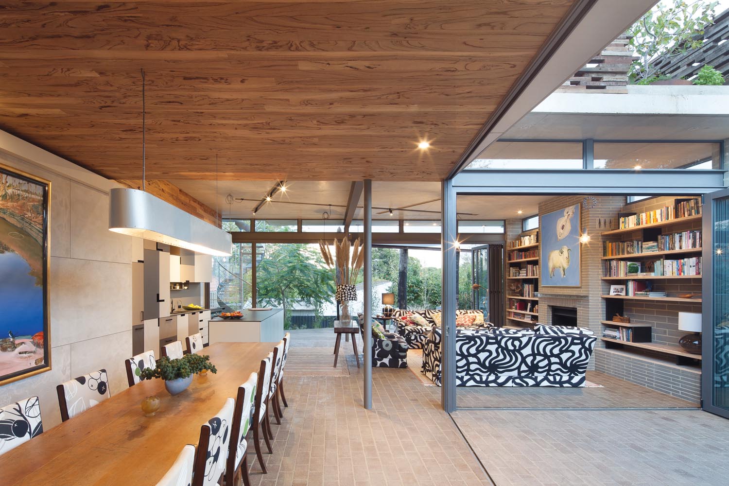 Ariane even bought 100-year-old timber from the old Bunbury pier, which forms part of the garden landscaping. Several other elements come direct from nature. “For example, the timber ceiling in the dining room was cut from a fallen tree on our farming property. It was milled on-site and now provides a magical, patterned, raw finish to the ceiling and giant pivot door,” Ariane says. “It just brings joy to look at it and its carpentry craftsmanship.”