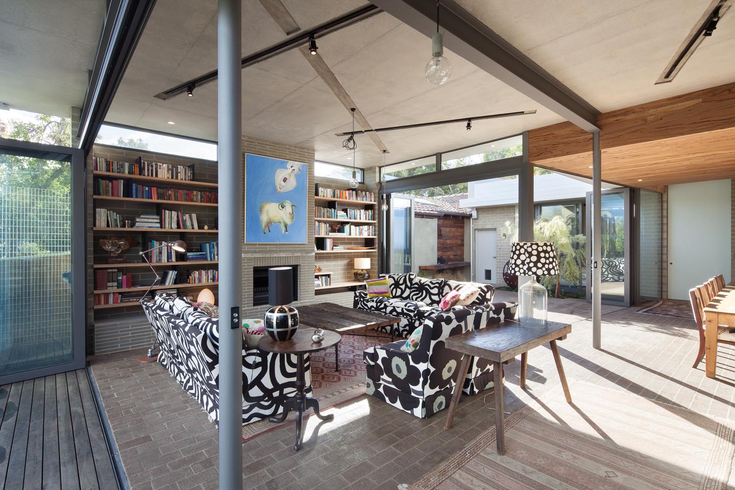 This house is built on a modest 400m² block in the conservative and wealthy suburb of Claremont in Perth. It’s a simple, pavilion-style home, which makes the most of its small block. However, it has the ability to be easily transformed. Around half the walls are glass, and can be opened up to create a huge single room incorporating the central courtyard. Inside, there are moveable walls too. Ariane didn’t want to restrict rooms to one use. Even elements of the kitchen can be relocated. Much of the look is mid-century style, inspired by homes Ariane grew up in. “The brief to self was easy: build an easy-care and easy-living, happy, beautiful and cheap house using sun, wind and light to maximise the potential of the site,” says Ariane, who lives with her husband, Neil.