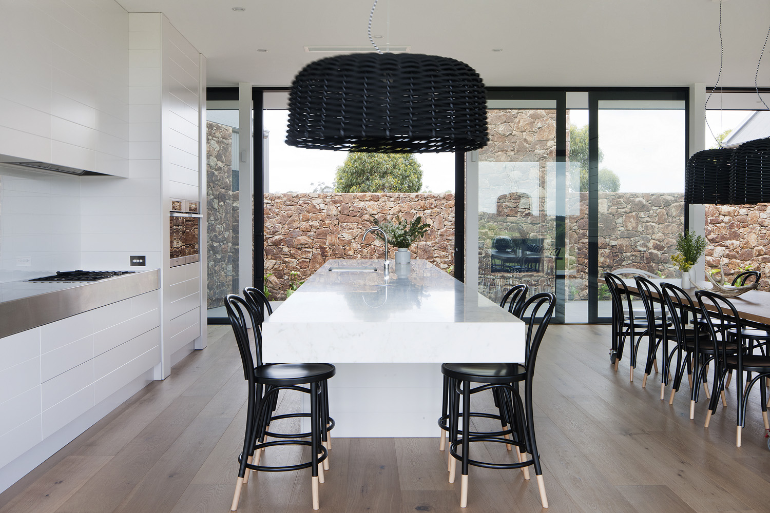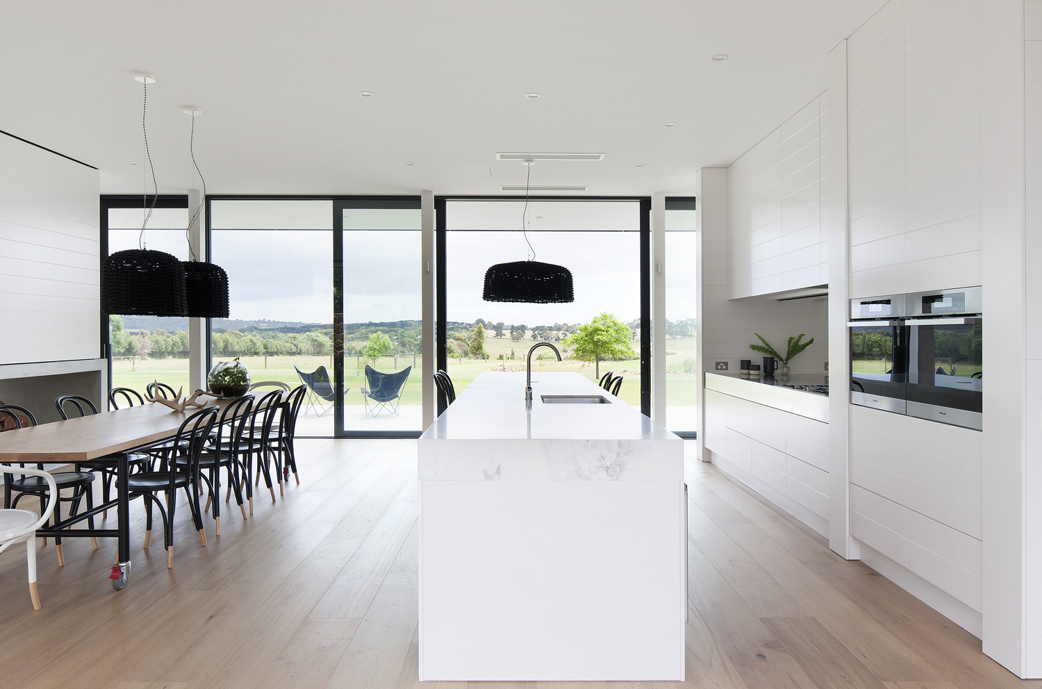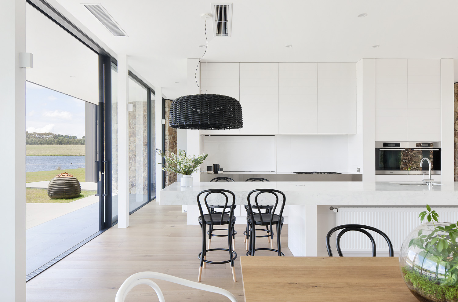 The interior palette is consciously minimalist, with white walls and joinery working with the timber floorboards. “Select furniture and fittings juxtapose this interior as carefully controlled accents,” says Tony. Such pieces include a black hide rug and oversized woven pendant lights, which bring an edge to a light and bright aesthetic. Environmental considerations are also present, with the orientation of the project boosting the performance of the structure when it comes to managing the extreme microclimate. Other considerations include double-skin cavity walls with heavy insulation, solar hot water systems, 80,000-litre rainwater tanks, hydronic heating and the use of low-VOC paints