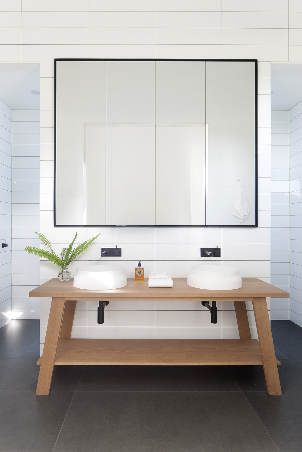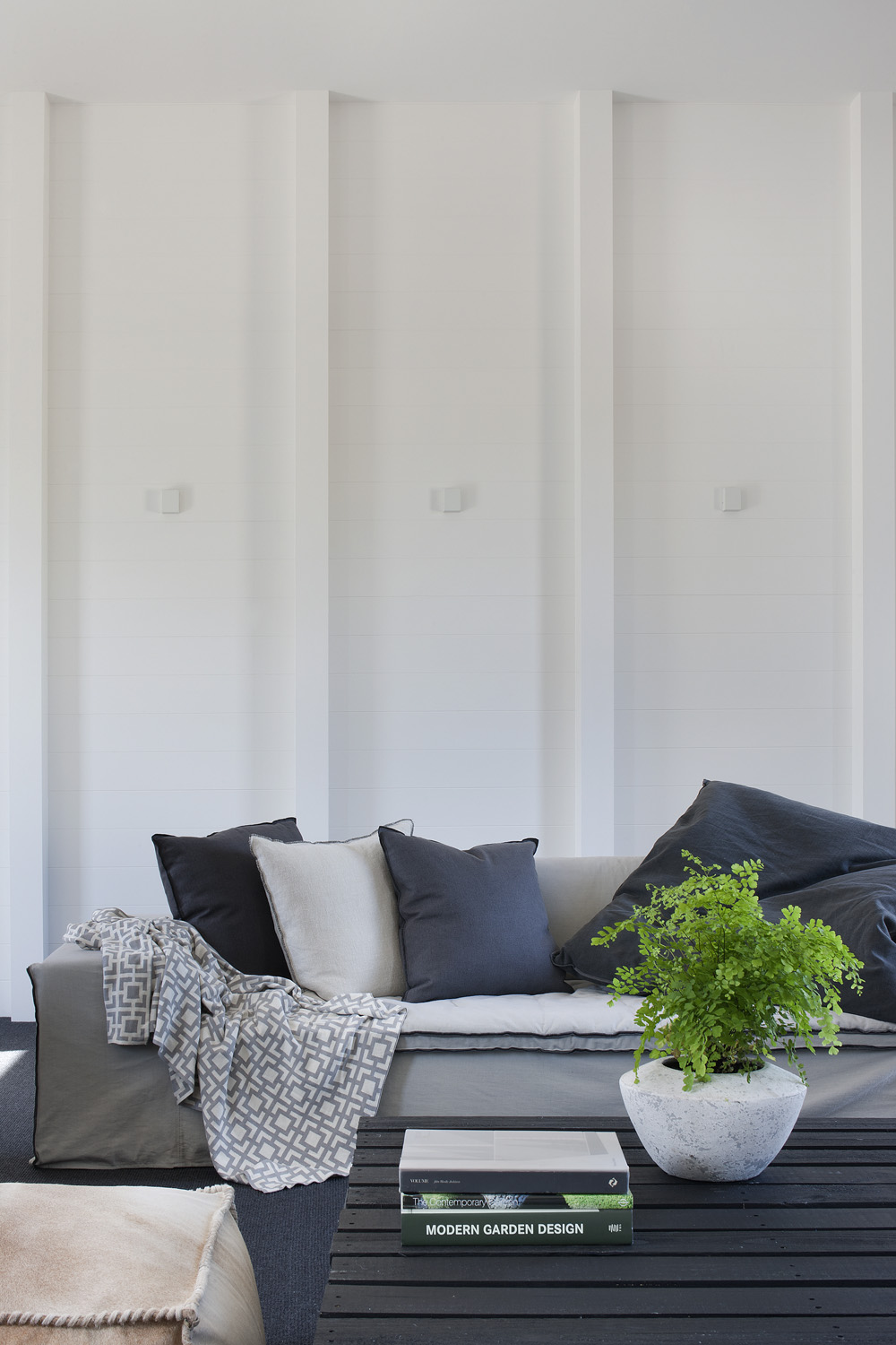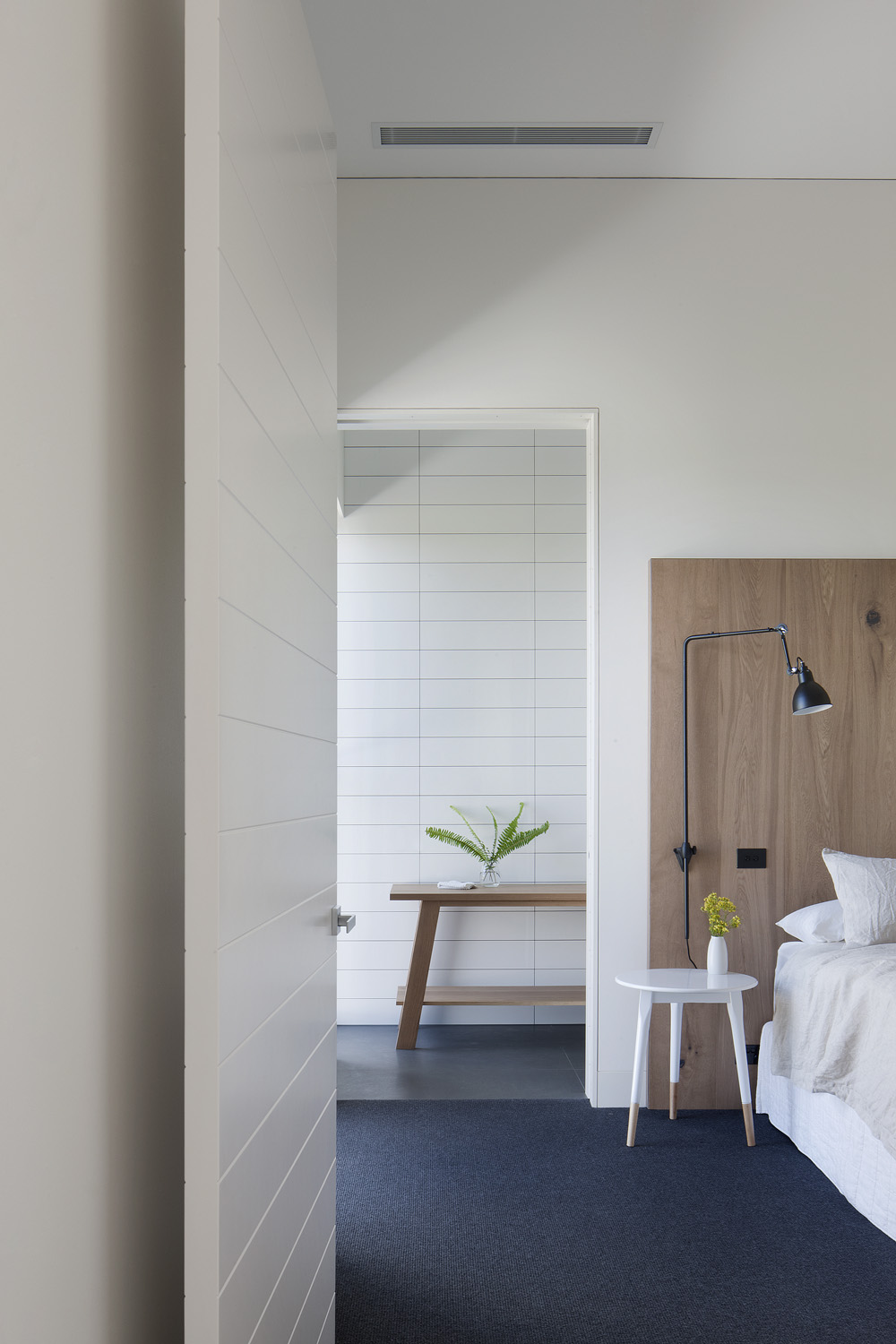 The interior palette is consciously minimalist, with white walls and joinery working with the timber floorboards. “Select furniture and fittings juxtapose this interior as carefully controlled accents,” says Tony. Such pieces include a black hide rug and oversized woven pendant lights, which bring an edge to a light and bright aesthetic. Environmental considerations are also present, with the orientation of the project boosting the performance of the structure when it comes to managing the extreme microclimate. Other considerations include double-skin cavity walls with heavy insulation, solar hot water systems, 80,000-litre rainwater tanks, hydronic heating and the use of low-VOC paints