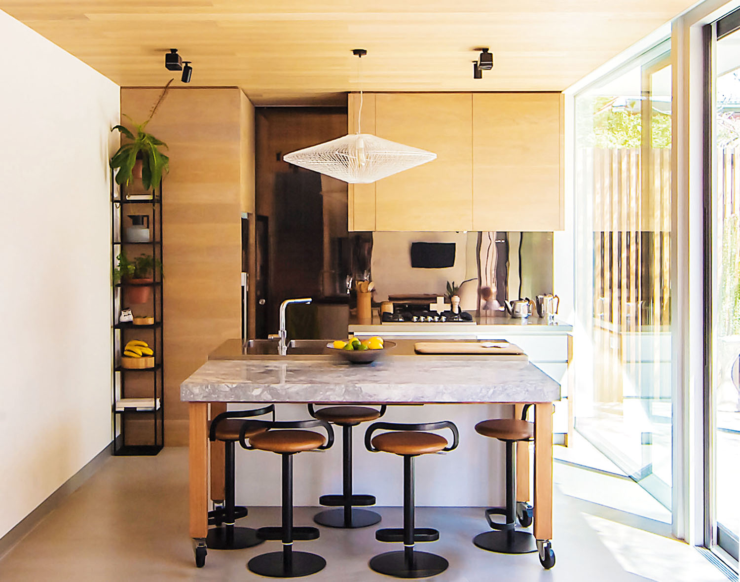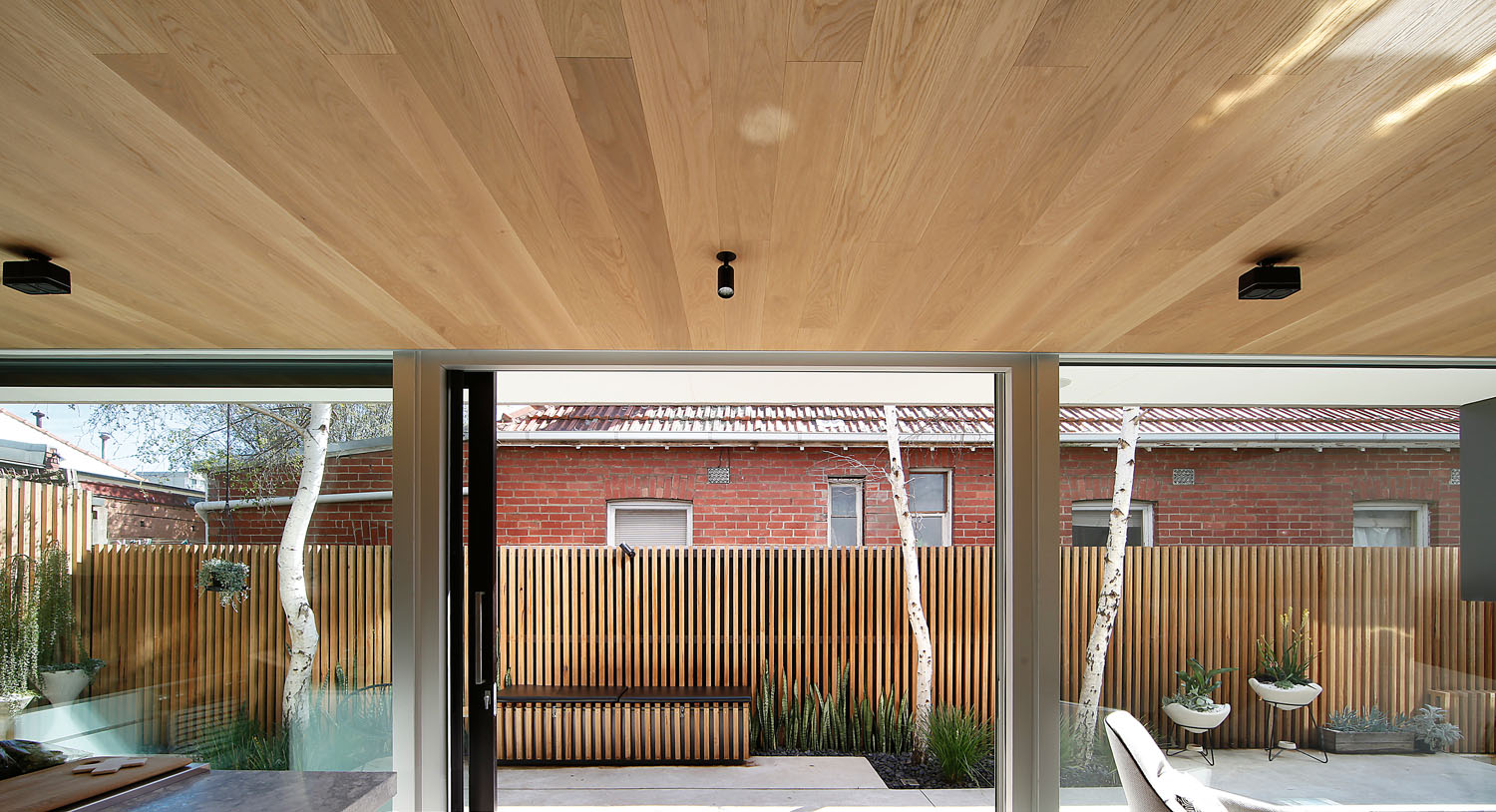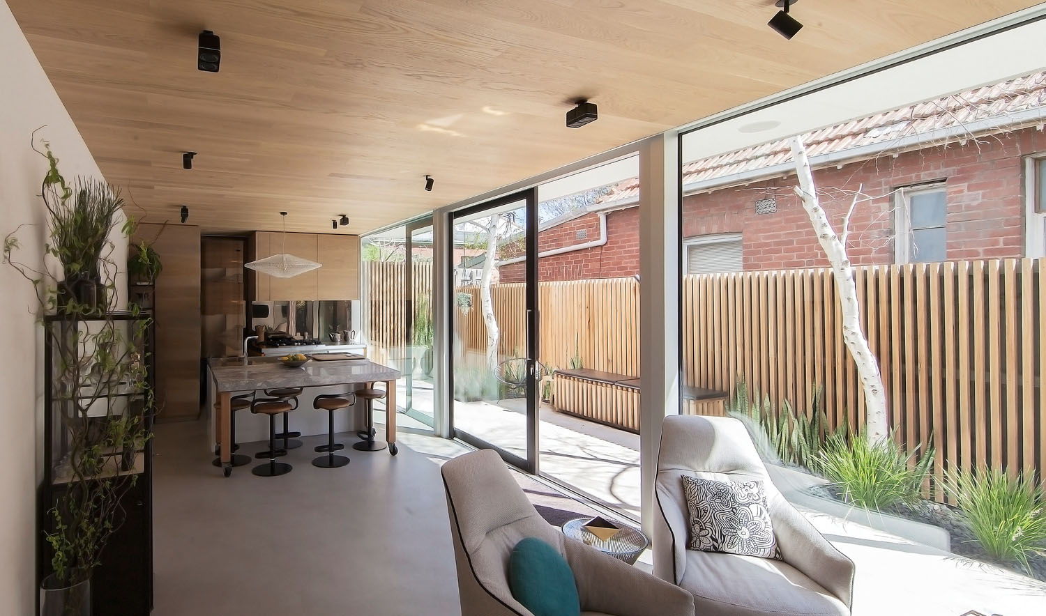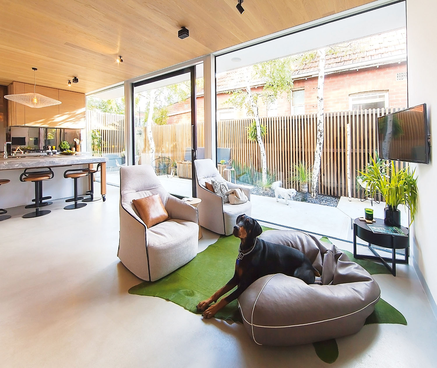 Once two claustrophobic rooms, the new living area is big on space thanks to a fully glazed wall and sliding glass door that “dissolves the barrier between the living area and the garden”, says Rob. A highlight of the new room is the tongue-and-groove timber ceiling and joinery that’s the perfect match with the vertical timber battening found mere steps away in the garden. The use of concrete in this space was a risk that paid off, with the Pandomo floor making its way from the living area to the courtyard, ensuring continuity in style and aesthetic.