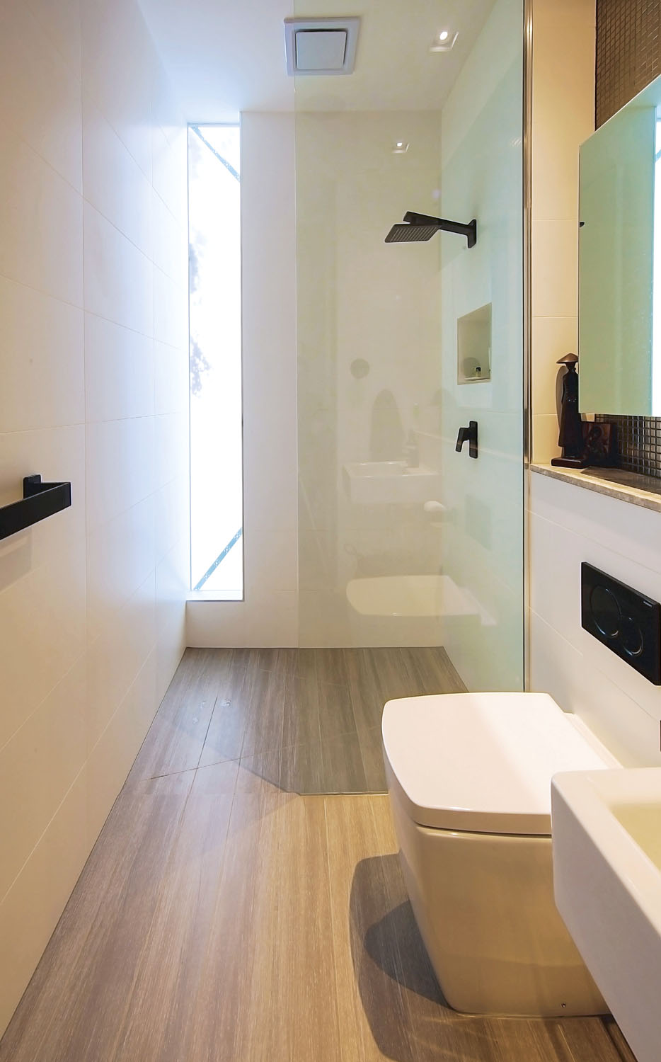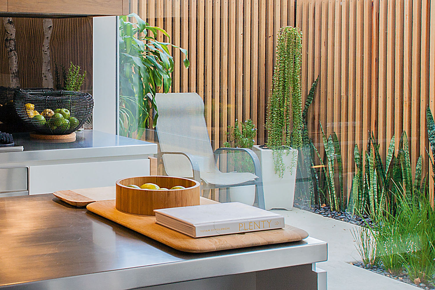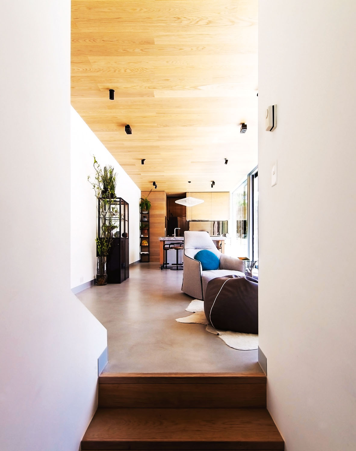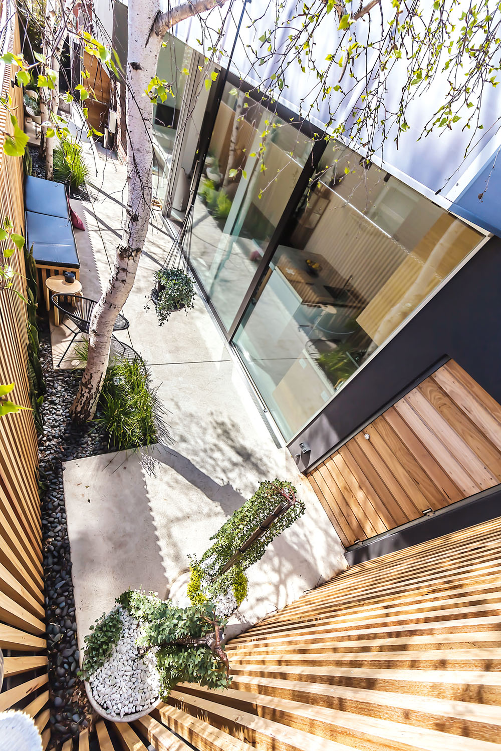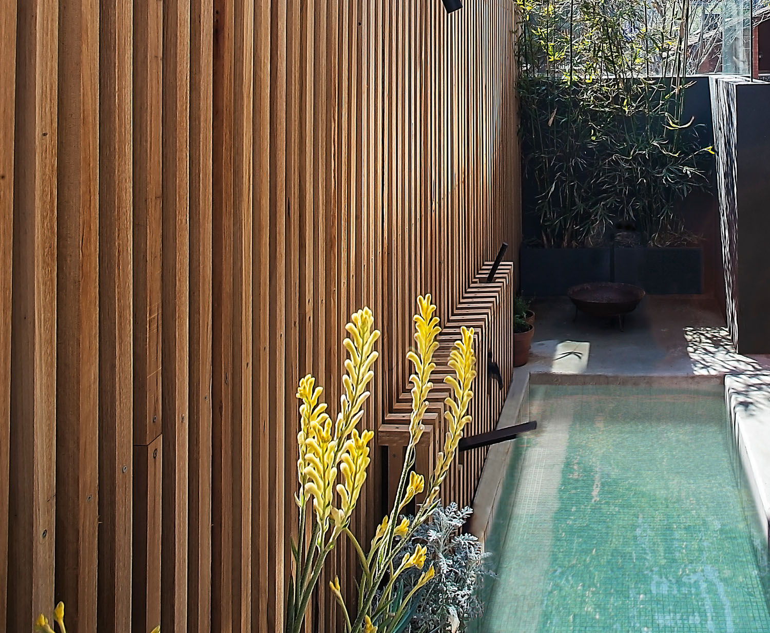Once two claustrophobic rooms, the new living area is big on space thanks to a fully glazed wall and sliding glass door that “dissolves the barrier between the living area and the garden”, says Rob. A highlight of the new room is the tongue-and-groove timber ceiling and joinery that’s the perfect match with the vertical timber battening found mere steps away in the garden. The use of concrete in this space was a risk that paid off, with the Pandomo floor making its way from the living area to the courtyard, ensuring continuity in style and aesthetic.