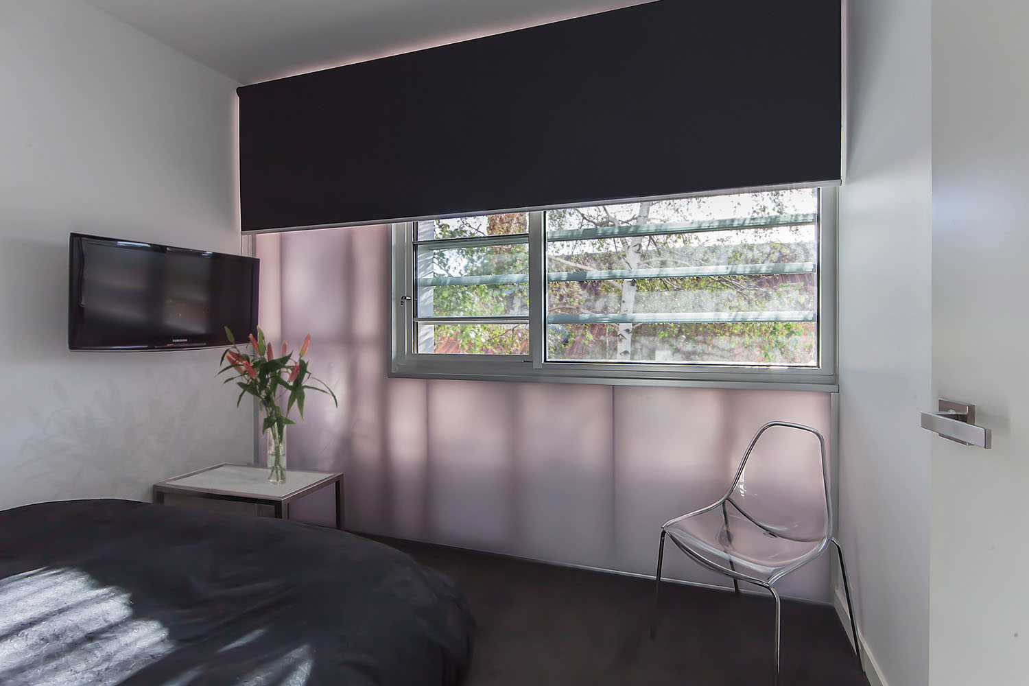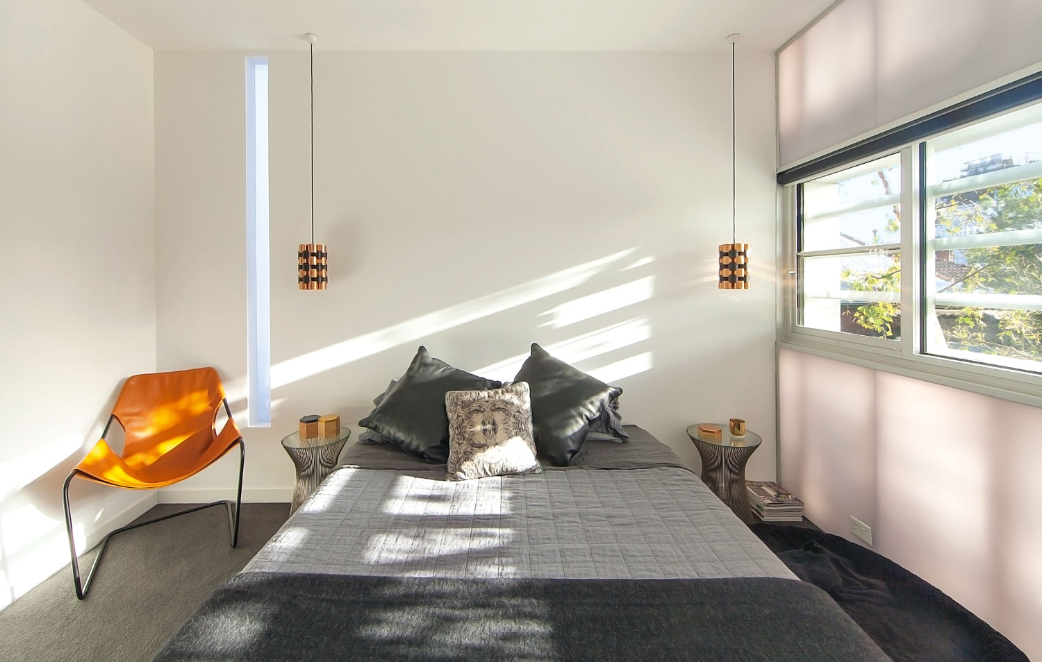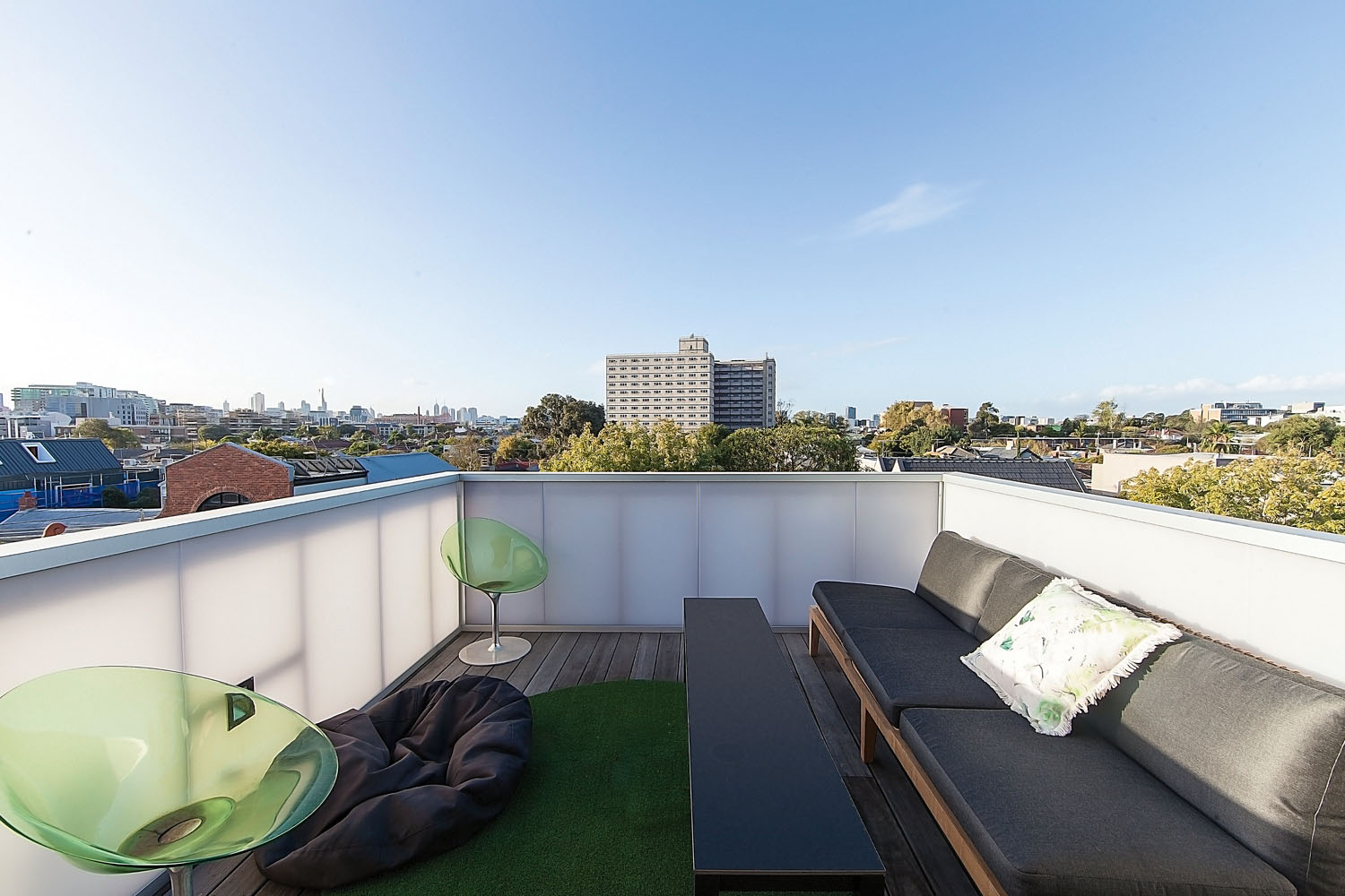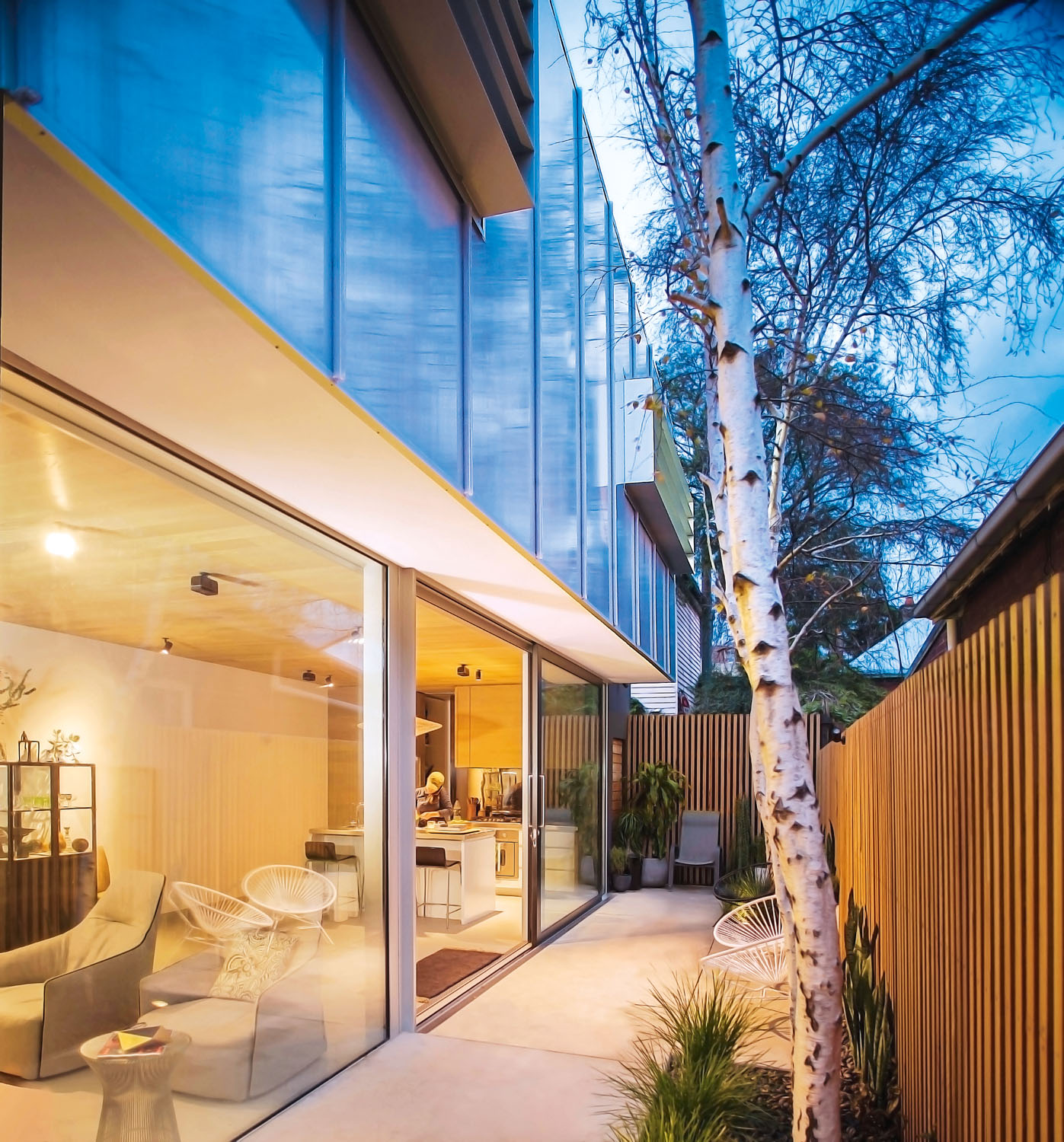 Now cantilevered over the garden, the first-floor bedrooms and ensuite are cocooned in the ‘skin box’, a structure encased by polycarbonate balustrades with an aluminium privacy hood connecting it to the spaces below. “The inspiration for the skin box came from the idea of building fabrics of ‘skins’ that mediate their environments and filter light,” says Rob. “The idea was to float the first floor above the slender, existing ground floor and envelop it with a lightweight translucent skin that would allow light through, control glare and privacy, and encourage a sense of spatial expansion to the courtyard. During the day, the skin seems silvery opaque, and at sunset, the evening sky reflects purple hues.” To access the box from the ground level is by way of a staircase that also leads up to the second floor roof terrace complete with picturesque views, a dining setting and plenty of seating to kick back and unwind with a drink in hand. “Providing a dramatic rooftop experience, the pop-up addition makes an idiosyncratic contribution to the streetscape,” observes Rob.