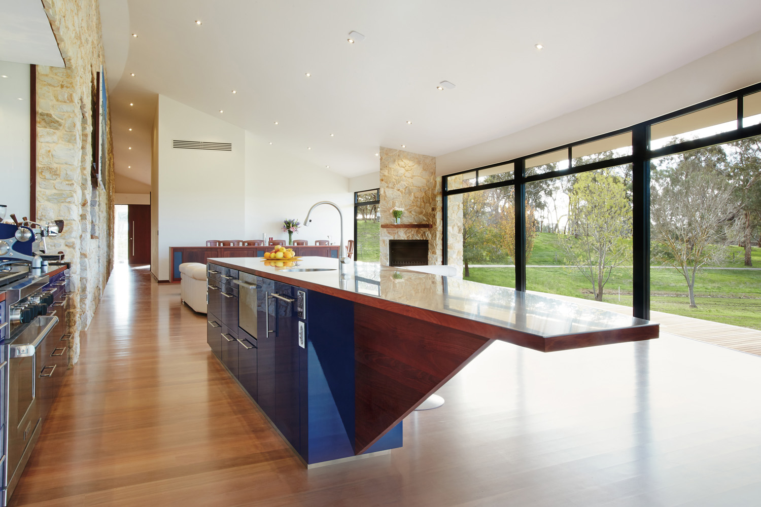 Colour Palette: Colour for this project is all taken from nature. Reddish timbers, sandstone, slate grey and evening sky blue are all tied together by the views of the green landscape from expansive windows