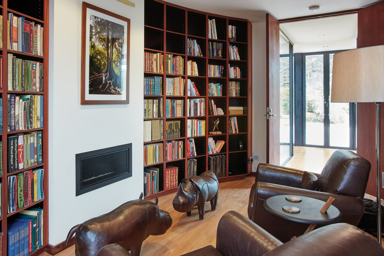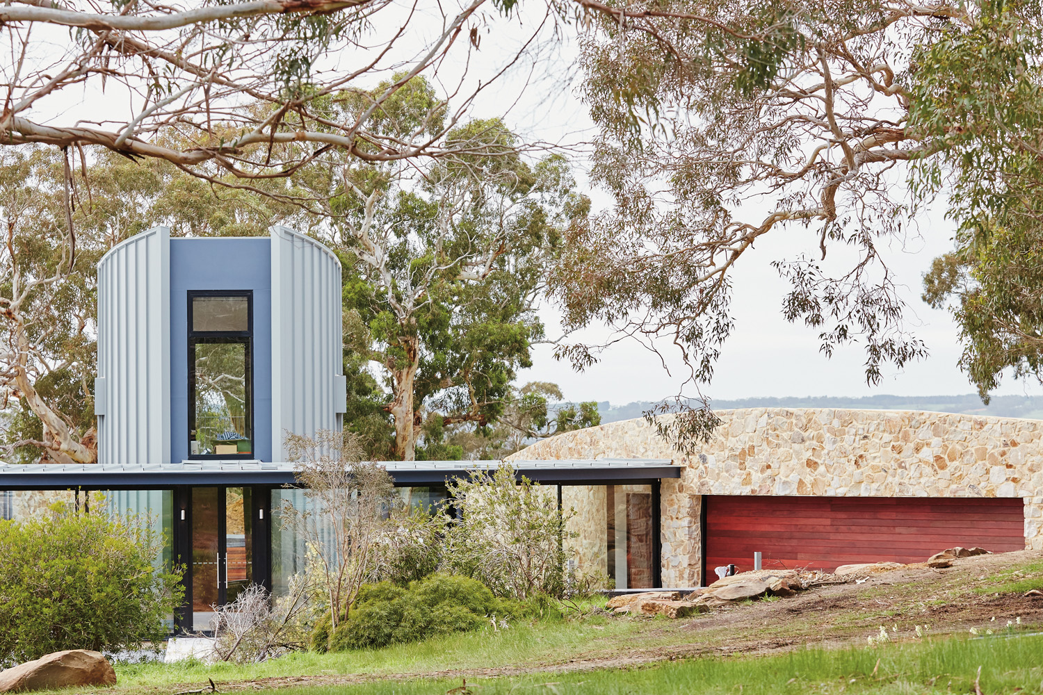 After the roof panels were fitted to the curved structure, work on the song tower began, much to the delight of Cate. Gargantuan glass panels at the back of the main house were installed shortly after, which invites nature into the home and enables the landscape to influence the house with a “split personality”, says Peter.