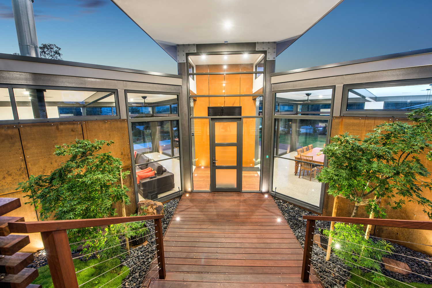 The distinctive design is reflective of the corner block position and the need for the prevailing views. A steel portal frame allowed the build to progress quickly once the excavations and slab was prepared. An important component was the large commercial windows and connection details were vital along with the fixings of the striking Corten cladding. Given the feature Porte Cochere, Entry Bridge, main deck and horizon pool, the external design was to feature exceptional timber work, stone and other natural materials to blend into the landscape.