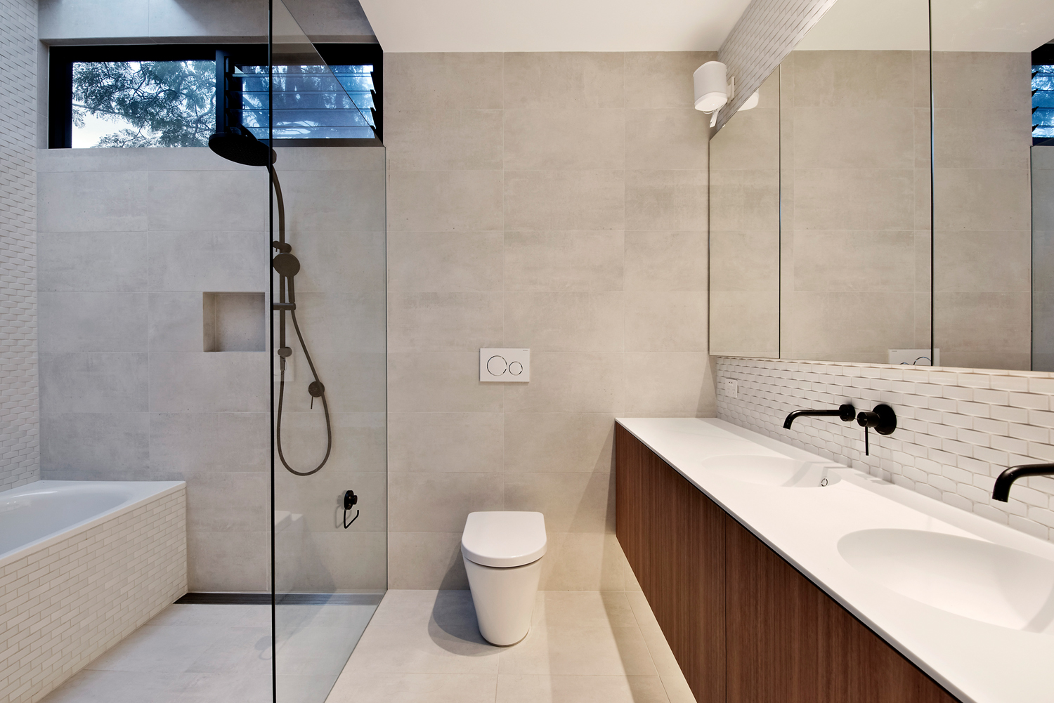 James Hardie Easylap pre-primed panel cladding (painted in Dulux Malay Grey) encases the top floor, and 30x30mm battens conceal joints. The result is a facade that enjoys the appearance of zinc cladding for a fraction of the cost. “Due to the positioning of the Mosman home on the hill, it was critical the building’s contemporary design nestled quietly into the existing context,” Victoria says. “Colours and forms were selected to be complementary and respectful to the existing landscape and neighbours.”