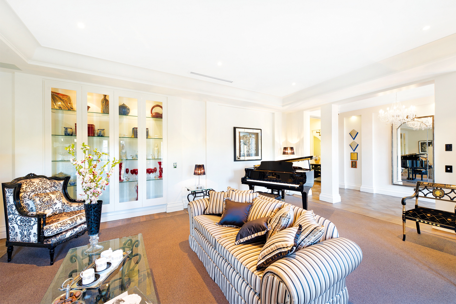 The grand colonnade entrance opens to a bright entry hall with a 3.4m raised ceiling and burnished European oak floors. The soaring space features freestanding and engaged columns and flows into the formal living room where French leadlight casement windows, glass cabinetry and a Jetmaster fireplace with an ornate carved marble mantlepiece vie for attention. Discreetly located beyond the main mirrored foyer is a vestibule allowing for internal access to the garage and a lift.