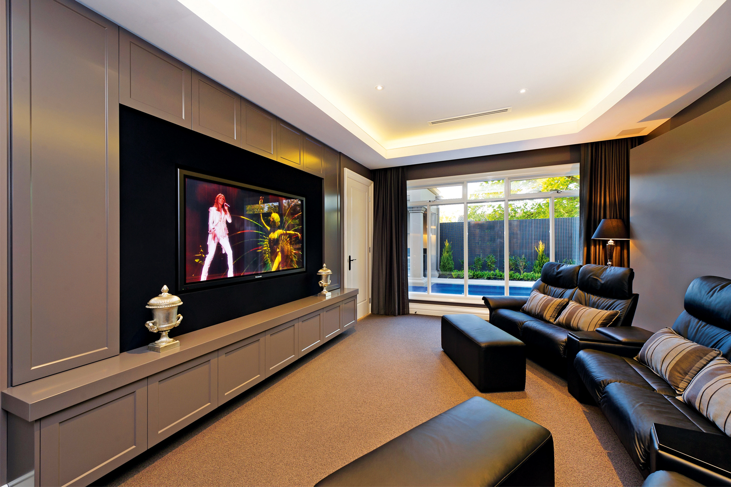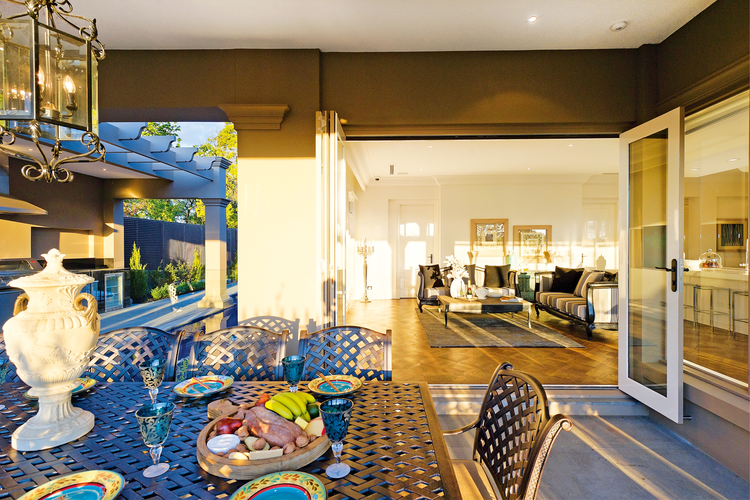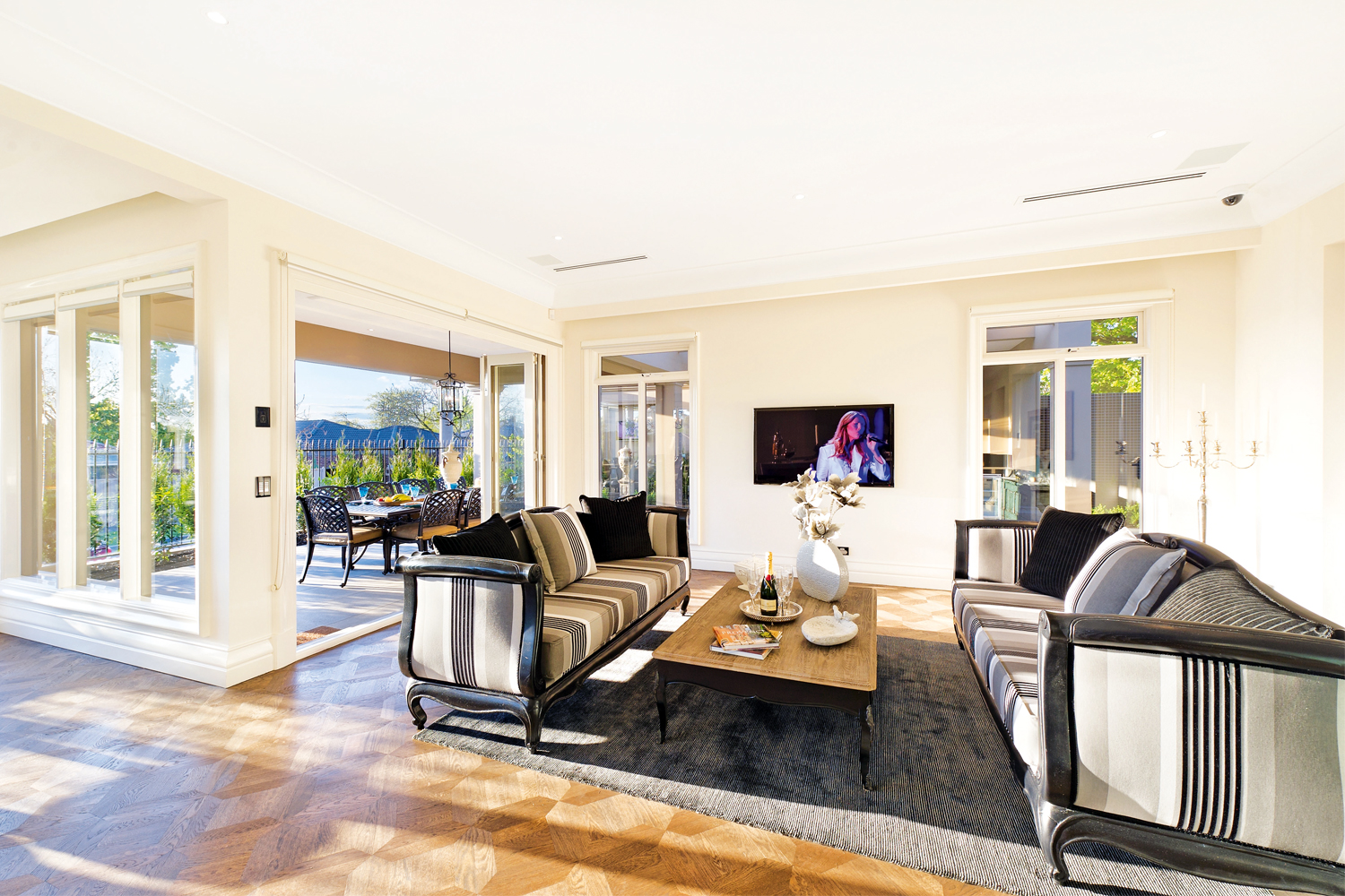 La Provence’s luxury extends outside, where a European-inspired loggia — an outdoor room complete with square colonnades, moulded plaster ceiling and sawn bluestone paving — offers high-tech entertainment with an outdoor kitchen, outdoor TV and audio system. The loggia enjoys views of a whopping 11.5m tiled wet-edge pool, accessible via the living room’s bifold doors and visible from the home theatre.