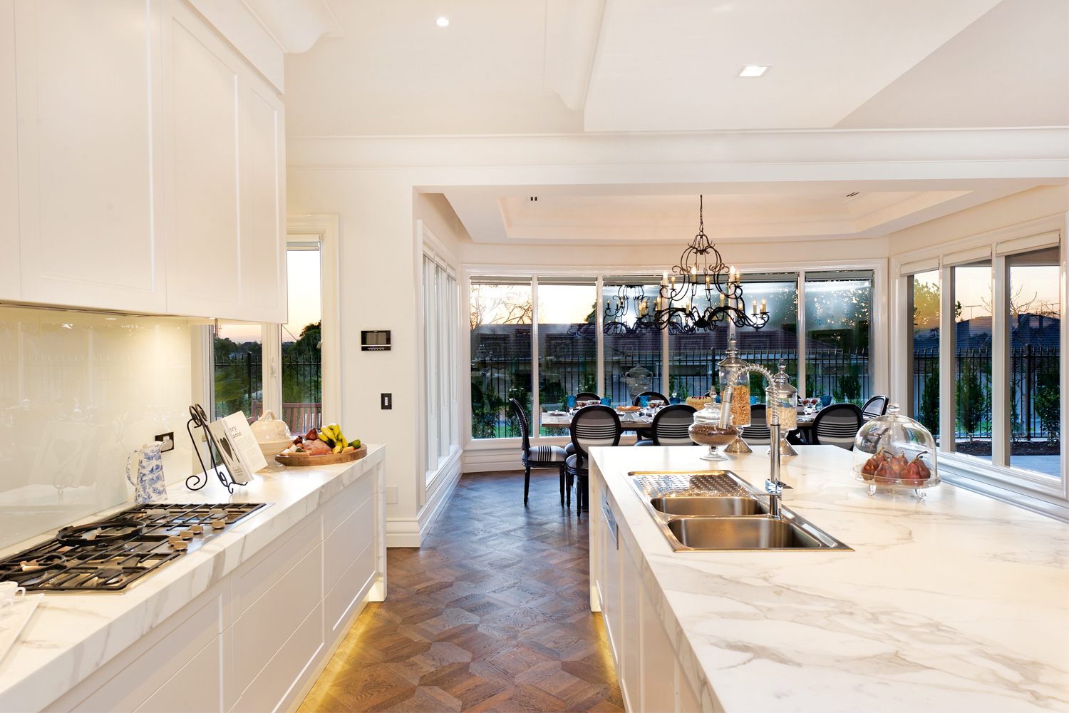 Moving past the staircase, French doors open to a spacious European-style kitchen with soft-close cabinetry, Miele stainless-steel appliances, waterfall marble and an island bench big enough for a football team. A concealed butler’s pantry keeps the kitchen clear and houses marble benchtops, in-built wine racks, a fridge and plenty of storage. The roomy dining area accommodates up to 14 and is bordered by a sweeping curved window.