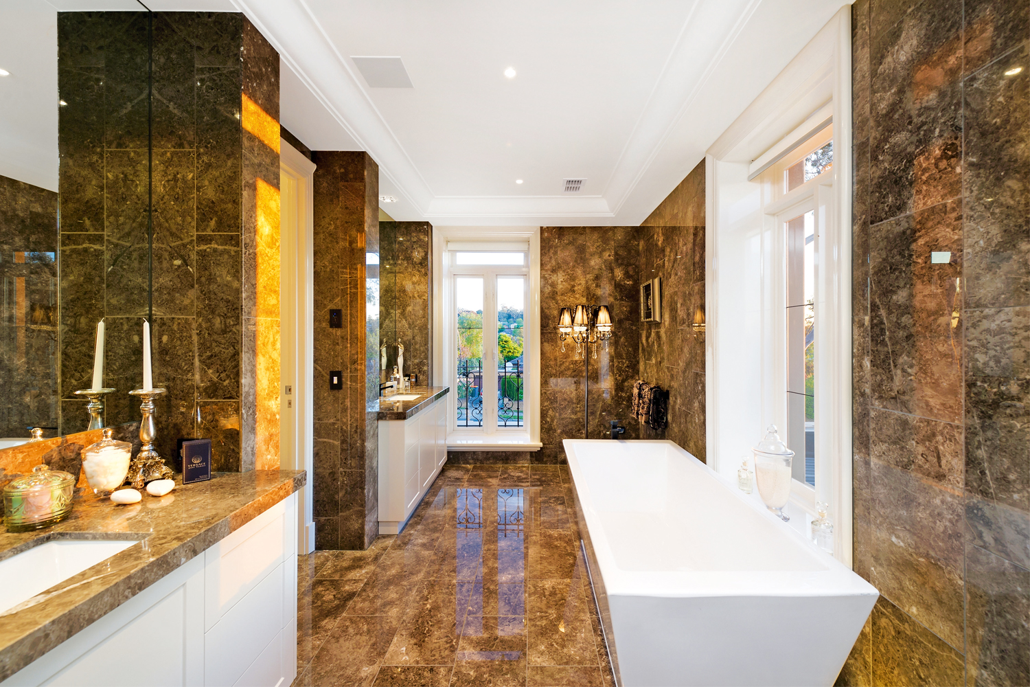 Upstairs, the triple-chandeliered main bedroom is like a fairy tale, where casement windows reveal a marble-paved Juliet balcony above La Provence’s portico. All that’s missing is a lovelorn suitor professing their affections from below. What’s not missing is a marble-encrusted ensuite with free-standing bath, spacious shower, twin vanities, full-height marble wall tiles and smart wall recesses. Double doors from the main bedroom open to the central stairwell and landing, creating a natural division between the main suite and children’s rooms.