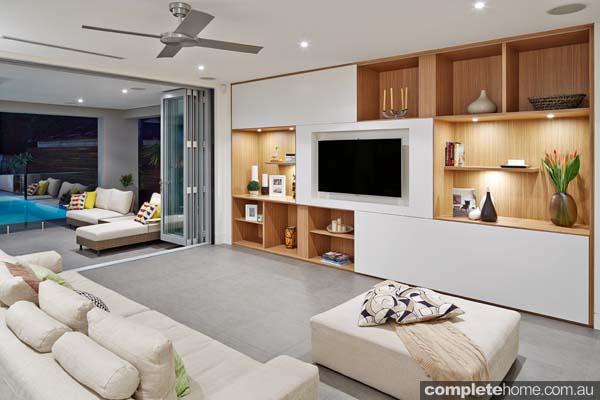 The use of porcelain tiles on the floor in all four rooms increases the continuity between these spaces. The tiles then flow out to the pool area, which is the perfect summer retreat. In the kitchen, a Quantum Quartz benchtop graces the island block and a black glass splashback works with the black bar stools and pendant lights, complementing the neutral colours of the timber and stone.