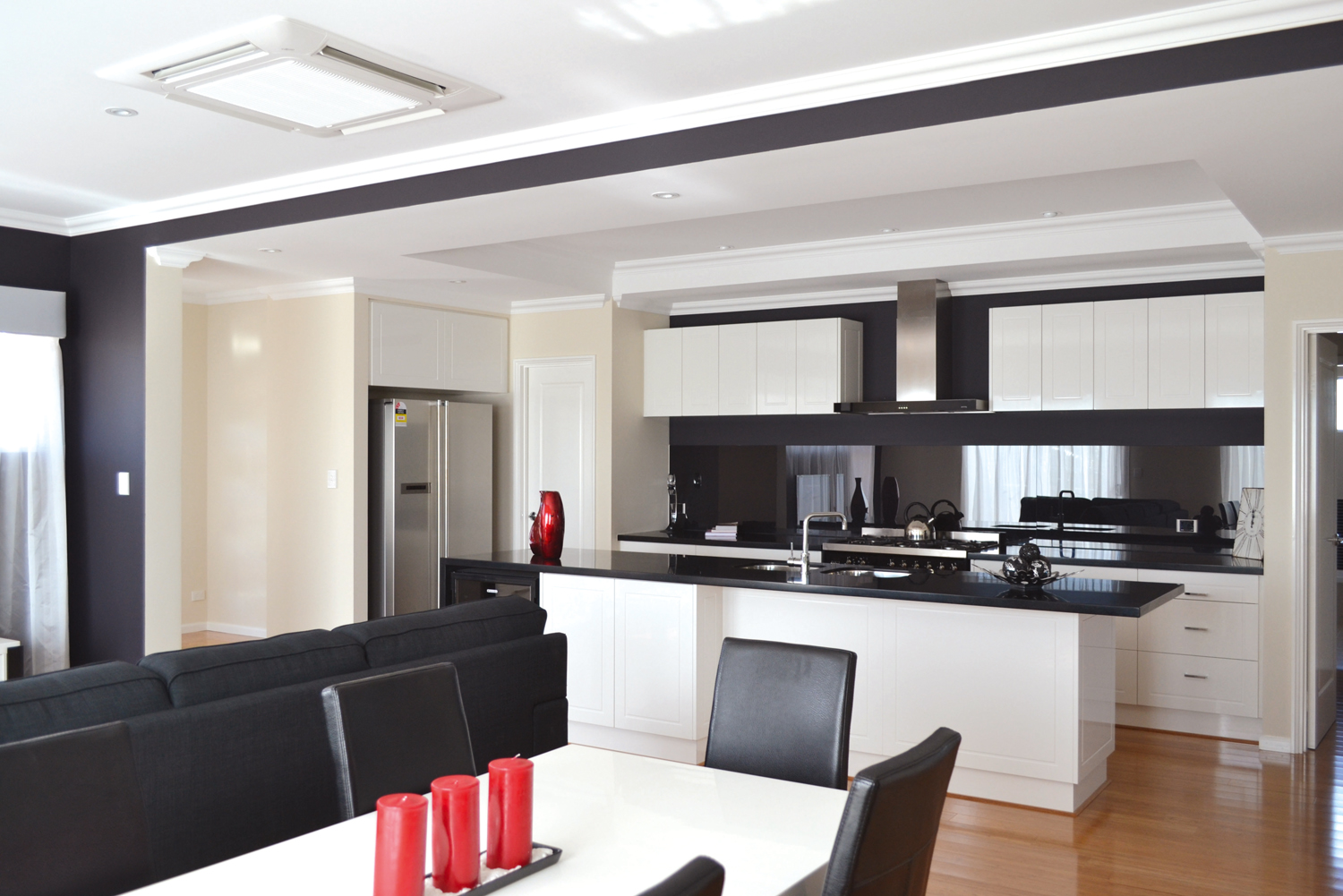 The most remarkable feature of this house is the kitchen. It boasts bright, wide-open space as well as beautiful stone benchtops, overhead cupboards and glass splashbacks. –