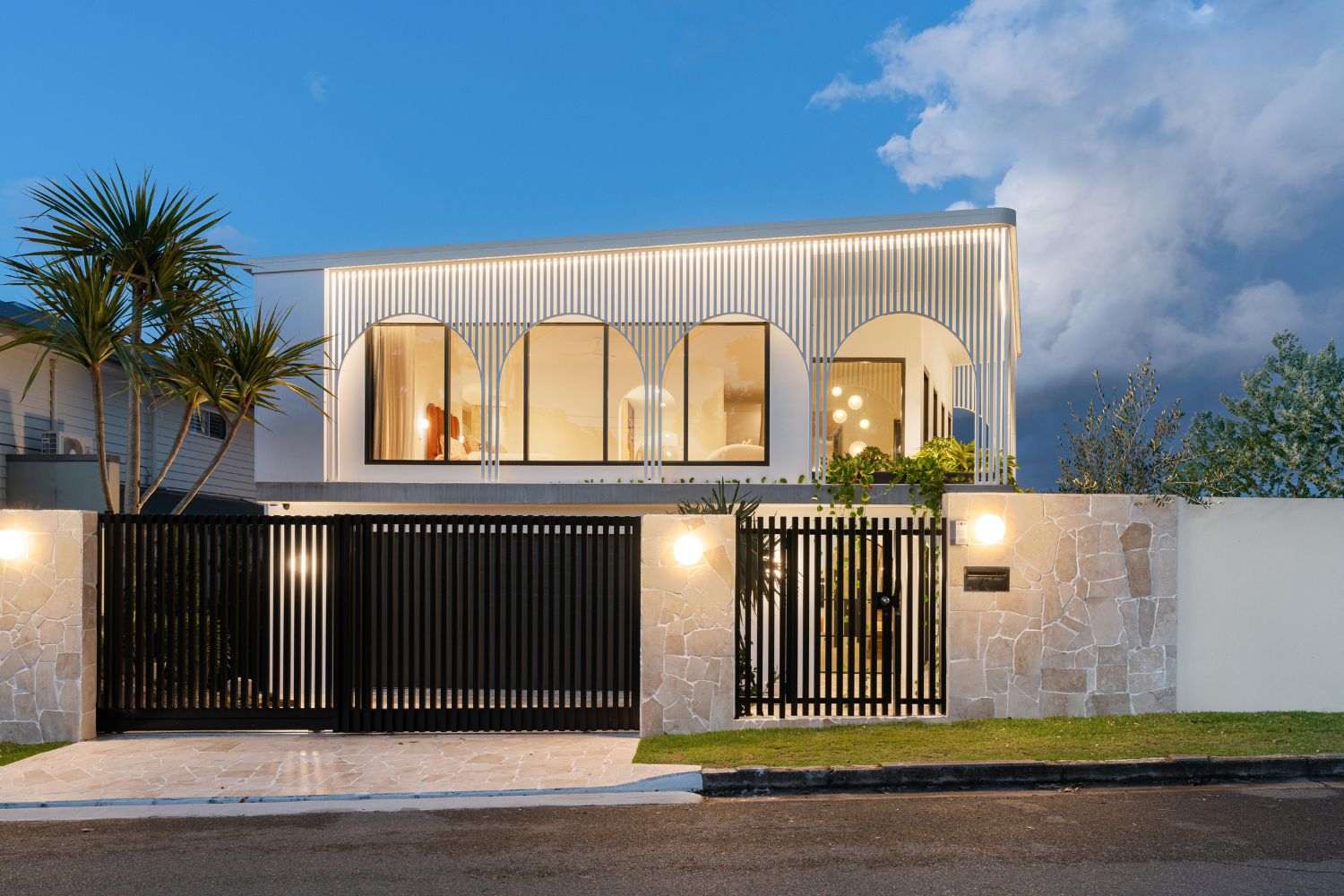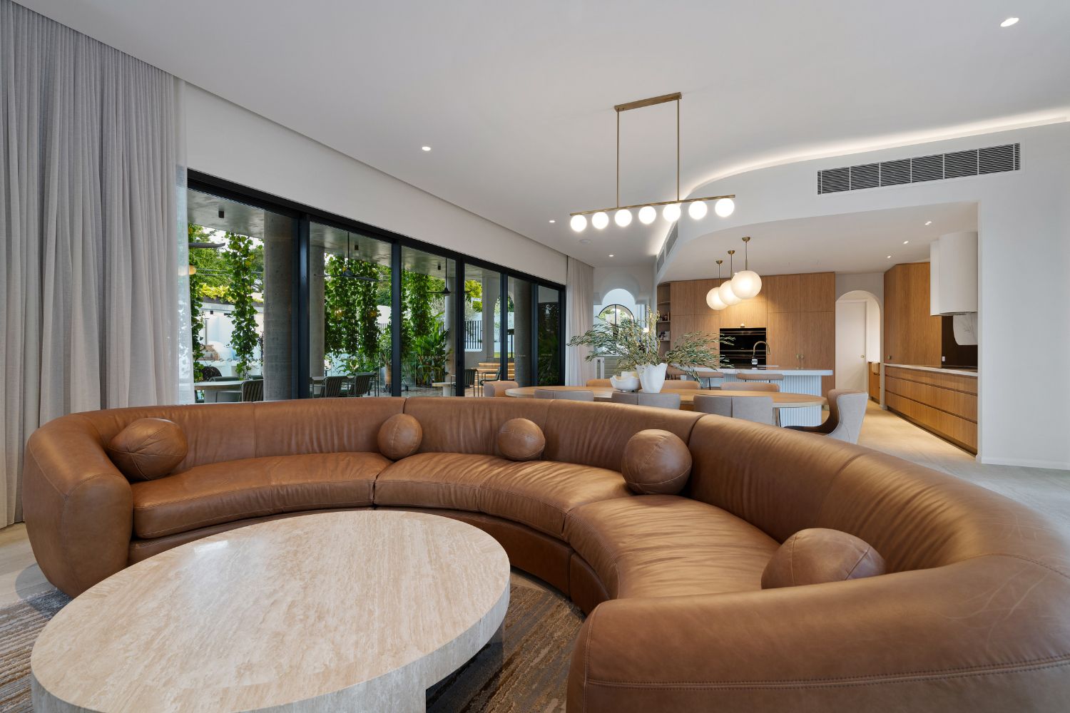 The use of travertine guided the meticulous selection of materials to enhance its presence throughout. Italian porcelain was used to create timeless internal spaces, while lush feature tiles in the bathrooms evoke the colourful charm of Mediterranean villages. Black window and door frames added a modern touch, harmonising with repeated design motifs such as arches, curves and columns, which appear across the facade, joinery, tiling, cladding and fixtures.