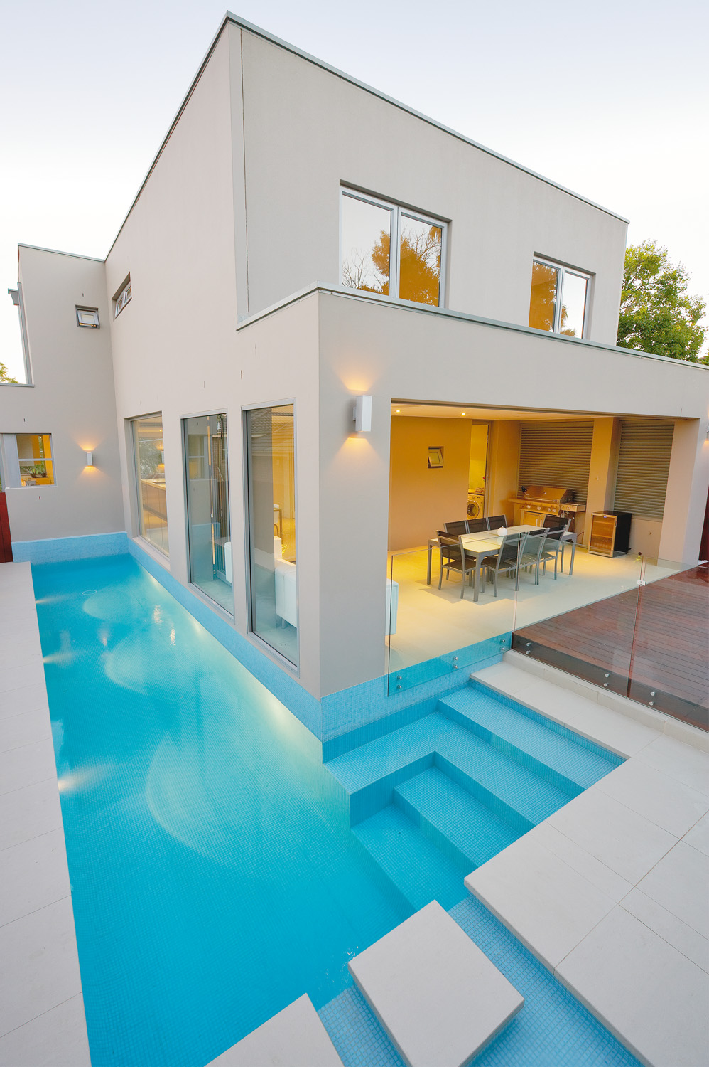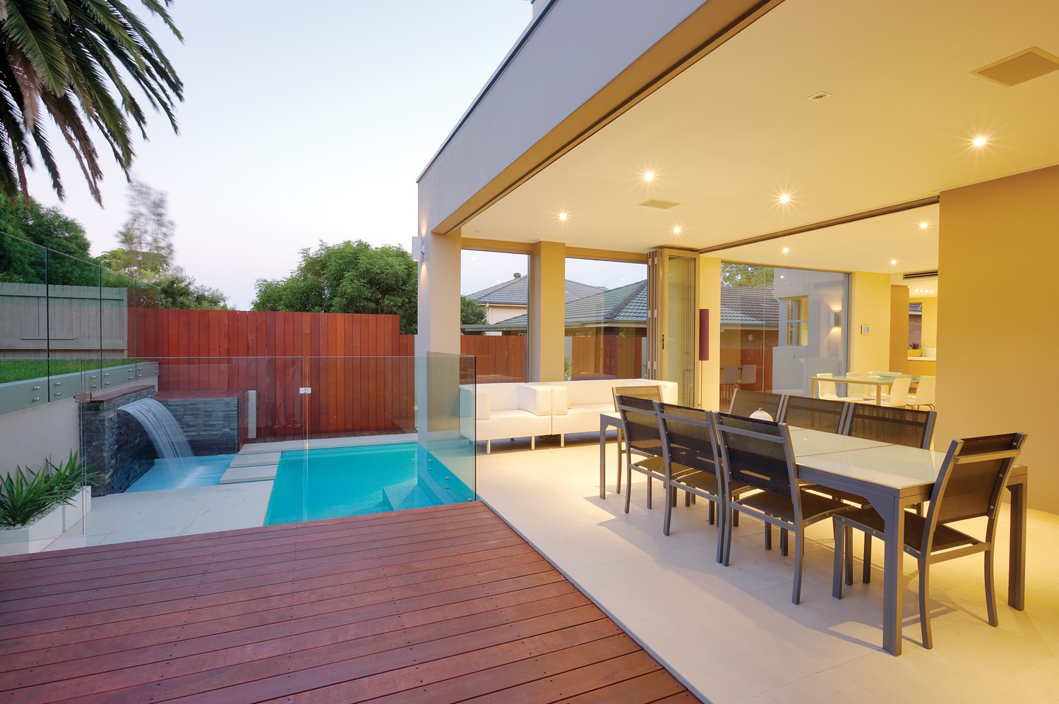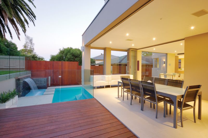 A floor-to-ceiling glass wall along the living and alfresco area gives a gorgeous view of the pool. This works to let in as much natural light as possible and emphasise the open feel.