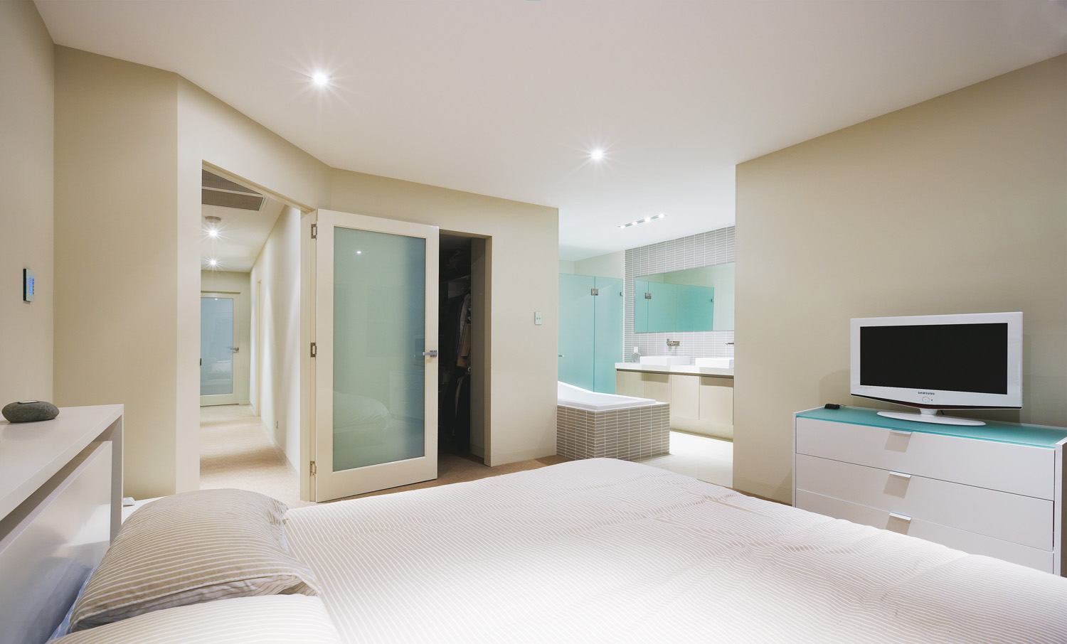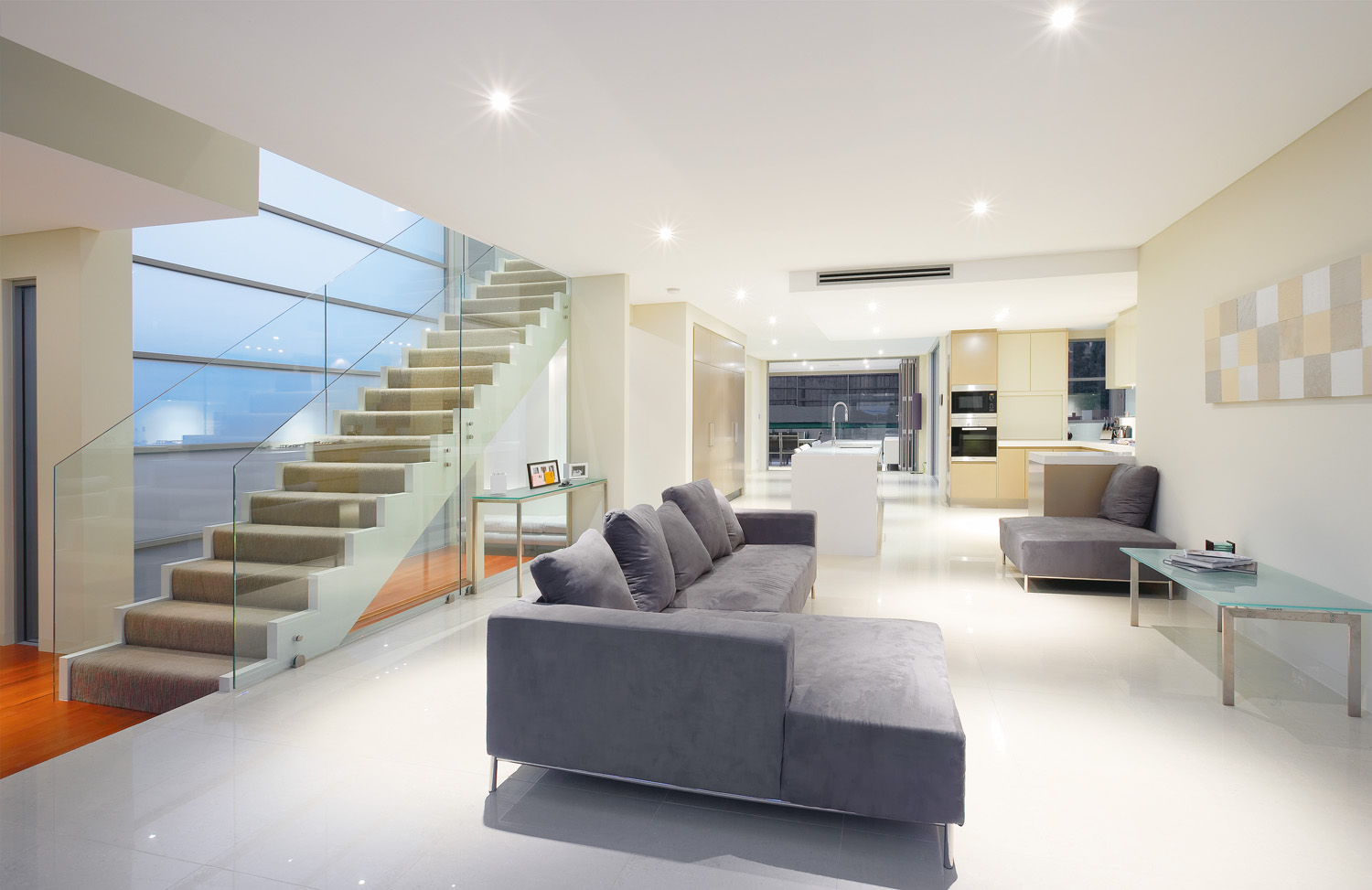 The second level incorporates the bedrooms and bathrooms, with the master bedroom set on its own level above. The master suite includes a fabulous private terrace which captures stunning views at night. The entire home has a very light feel. Glass has been used to tie areas together and Starr made sure each space was as large as it could be as the shape of the land is small and narrow.