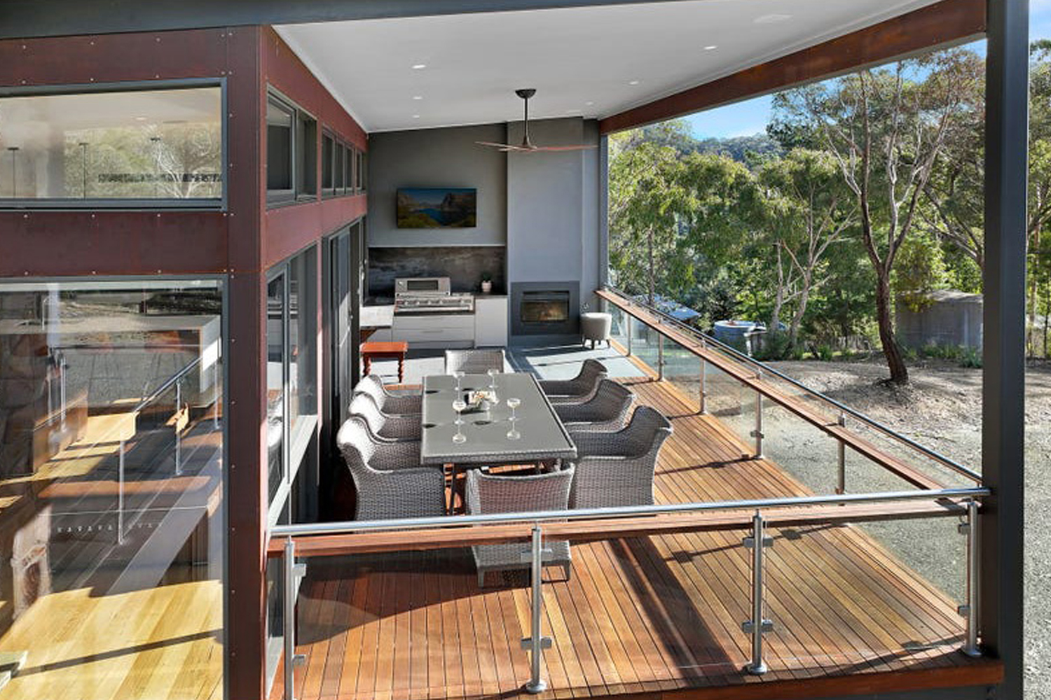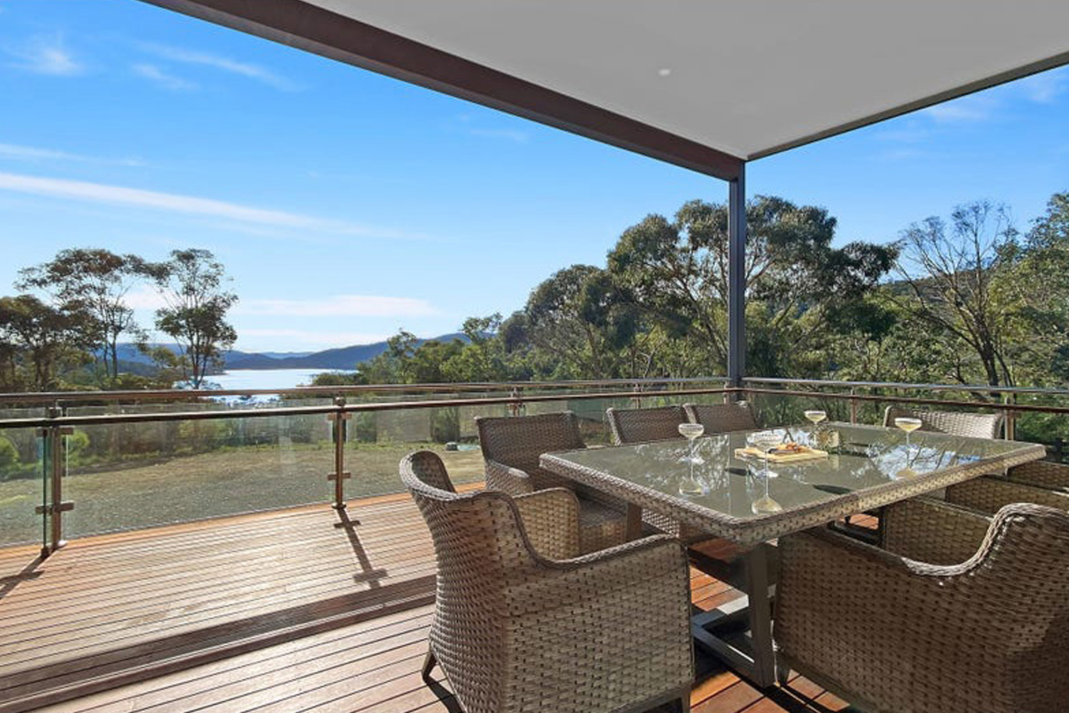 Capitalising on its elevated position and natural bush setting, this magnificent holiday home provides uninterrupted views across the lake to the distant mountains of the Victorian High Country.