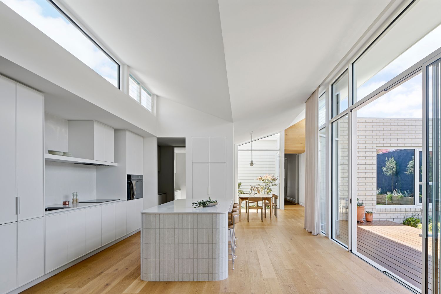 The butterfly roofline is one of Chahid’s favourite aspects of the design. “It’s a metaphor brought to life through the sculptural L-shaped rear extension and distinctive butterfly roofline,” comments Chahid. “This form not only introduces a sense of lightness and elevation, but also symbolises transformation and connection, guiding the spatial journey from the original heritage home to the new, open living spaces.”