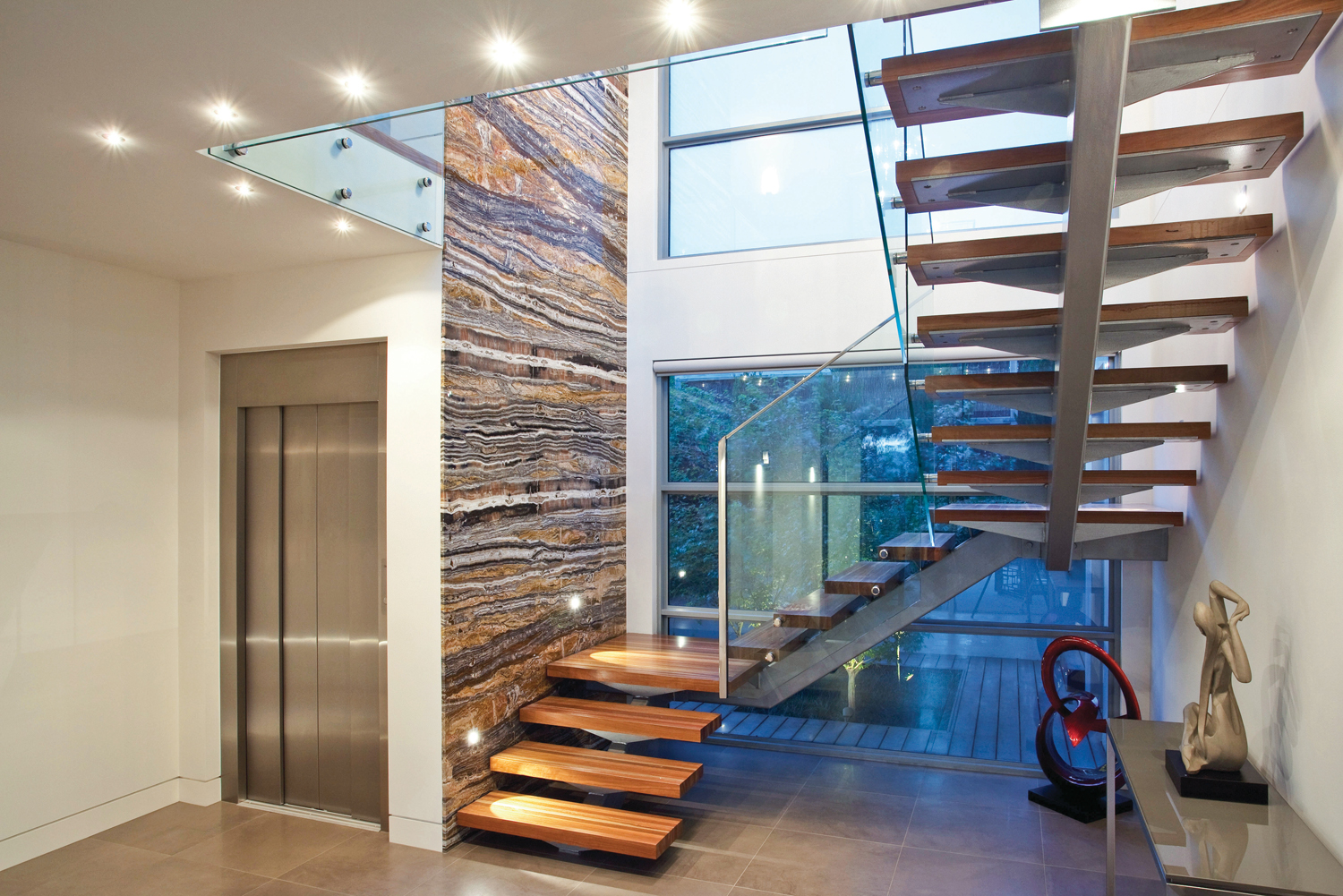 The upper and lower floors are connected by a lift and also a dark timber staircase that includes a granite feature wall, ensuring each aspect of the home is unique in design.