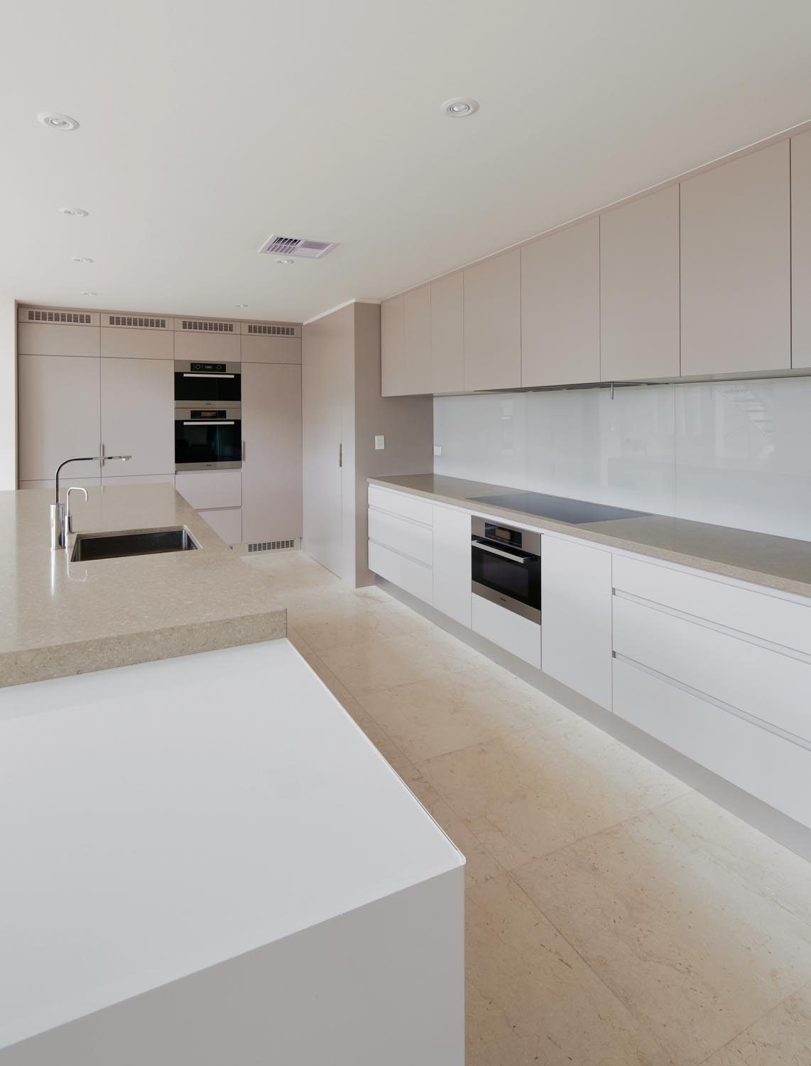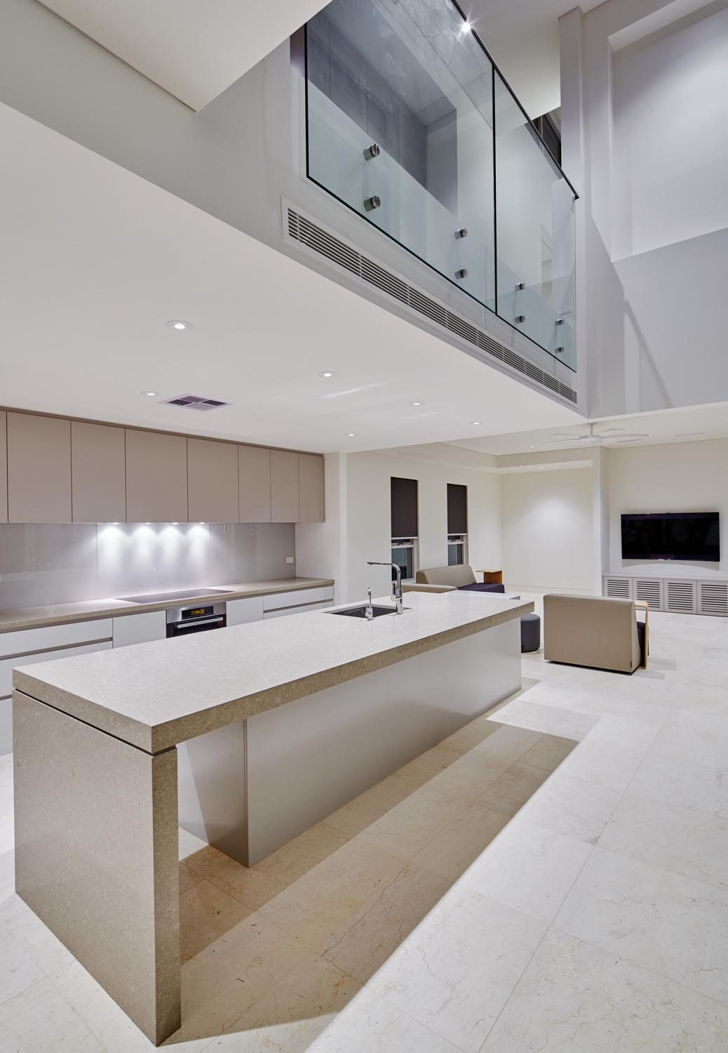 The brief focused on the creation of a sleek space, so a neutral colour palette was used to complement the open nature of the home. Furnishings in beige and brown with hints of silver and marble exude a calming atmosphere throughout. A timber floating staircase introduces an organic element into the home, serving as a feature of the house. The staircase also provides a view of the landscaped garden and pool, which includes a spa and cabana-style structure where swimmers can escape from the hot summer sun.