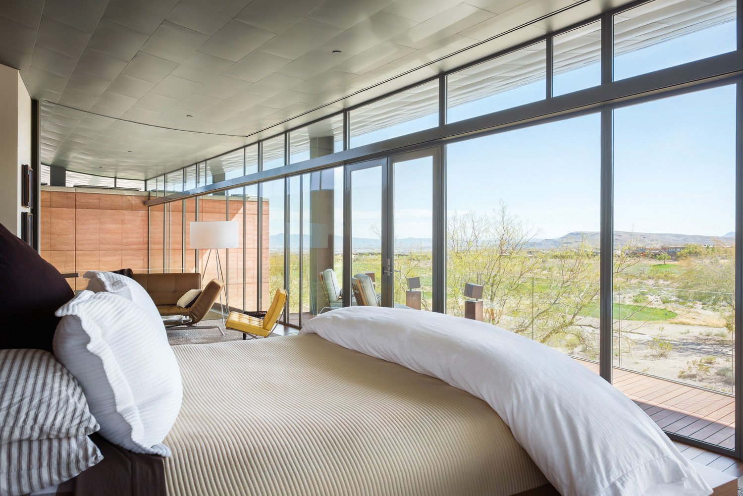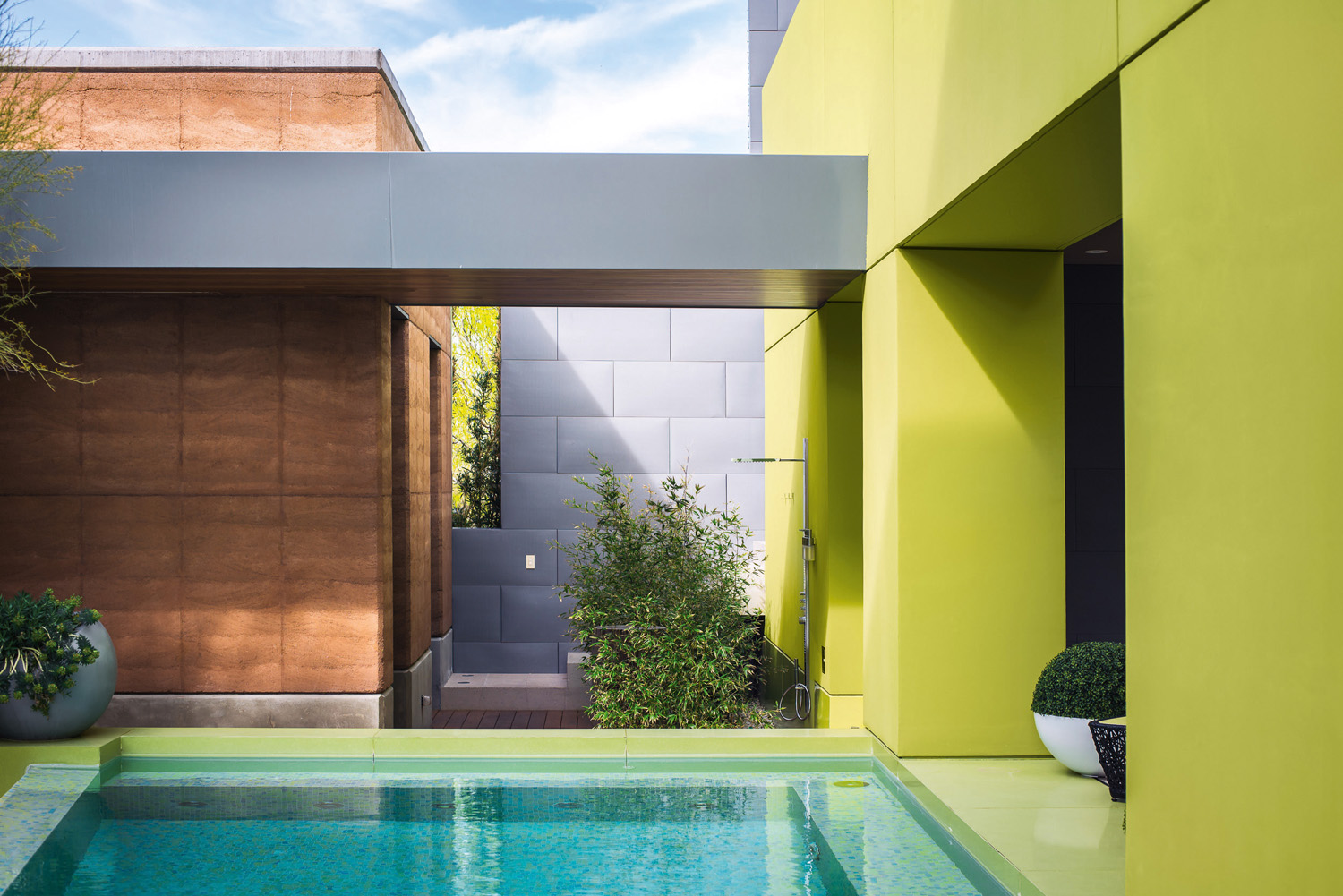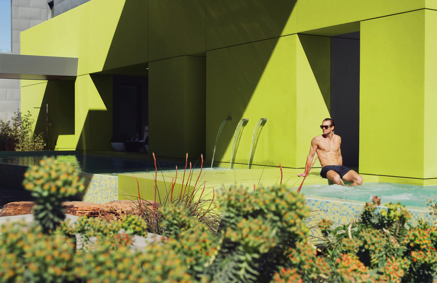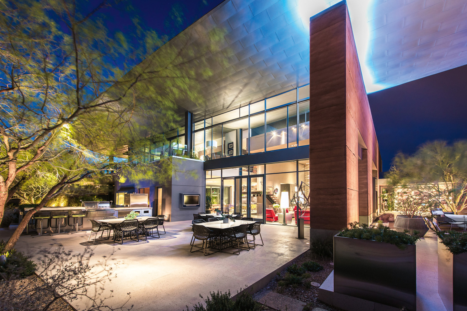 Shining the spotlight on the surrounding desert environment was important for John and Jonathan, but sustainability was also a prime consideration and had to be incorporated into the design in a big way — classic Vegas style. “We sought to employ elements of eco-friendly and climate-appropriate design throughout our home,” says John. The nine-bedroom property is surrounded by a one-of-a-kind 24-foot-high rammed-earth wall that is the first of its kind in Vegas and was created using traditional adobe construction methods. Electricity is also taken care of with a 10-kilovolt photovoltaic system harnessing the sun’s energy to offset one-third of the home’s electricity needs.