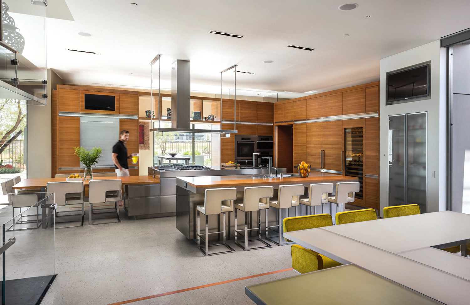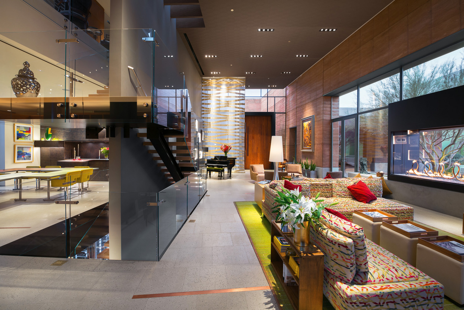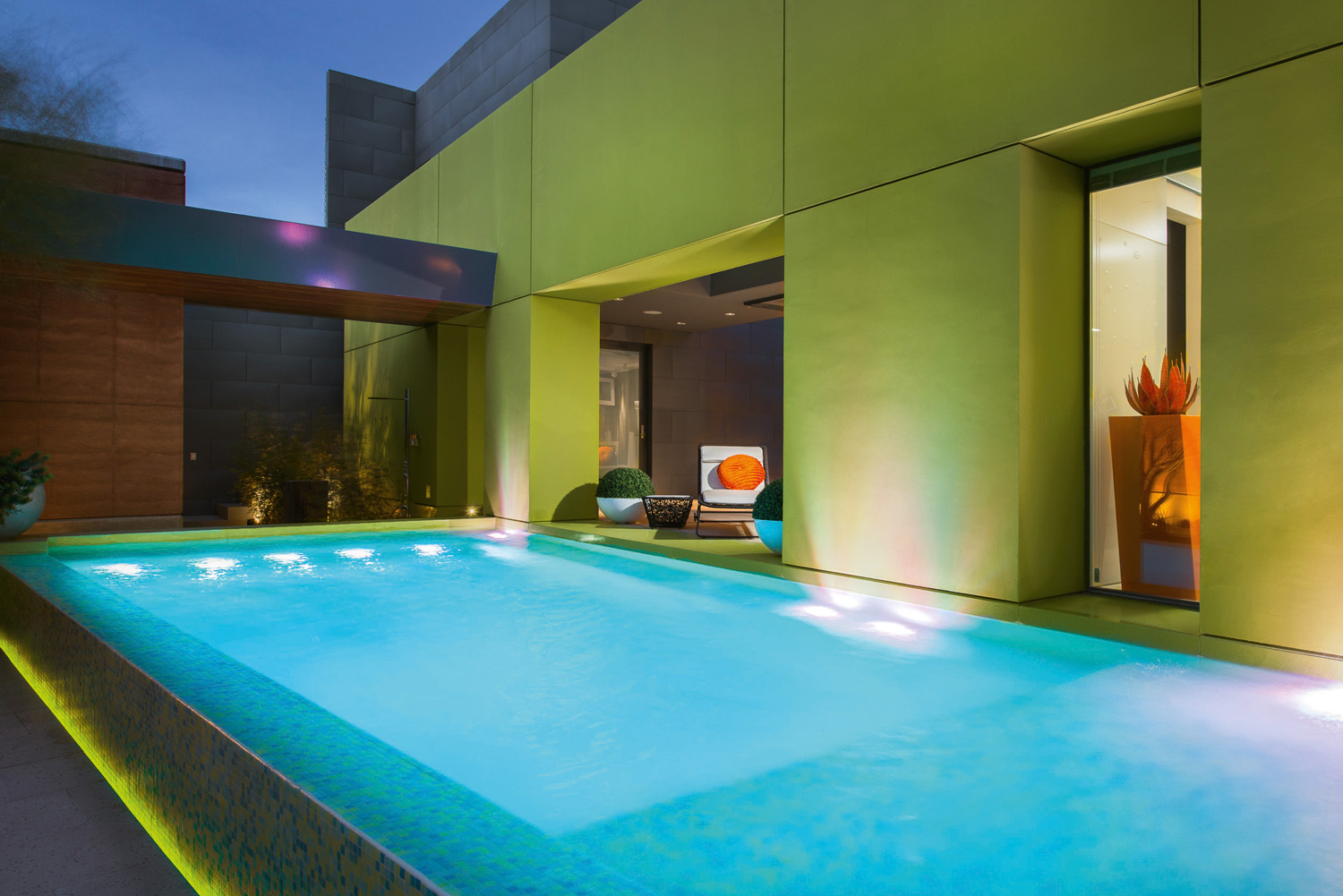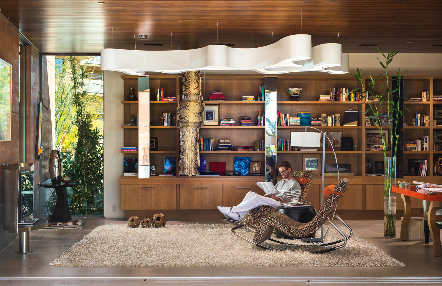 Shining the spotlight on the surrounding desert environment was important for John and Jonathan, but sustainability was also a prime consideration and had to be incorporated into the design in a big way — classic Vegas style. “We sought to employ elements of eco-friendly and climate-appropriate design throughout our home,” says John. The nine-bedroom property is surrounded by a one-of-a-kind 24-foot-high rammed-earth wall that is the first of its kind in Vegas and was created using traditional adobe construction methods. Electricity is also taken care of with a 10-kilovolt photovoltaic system harnessing the sun’s energy to offset one-third of the home’s electricity needs.