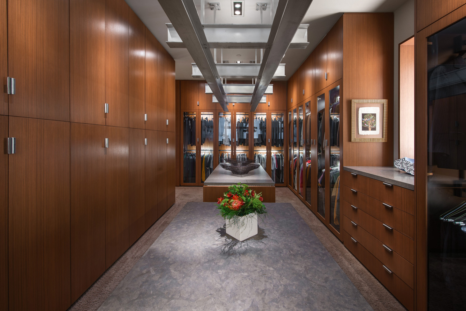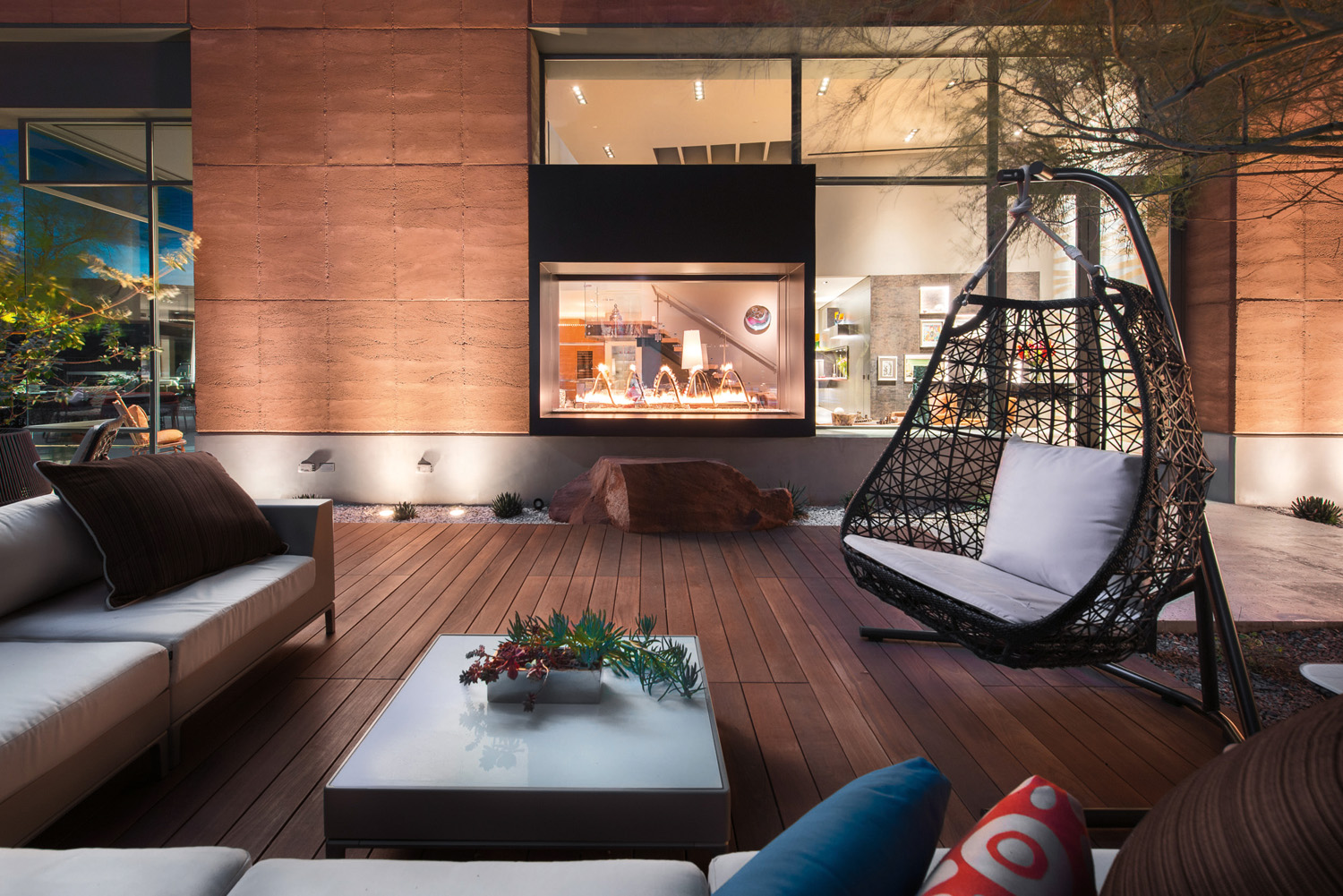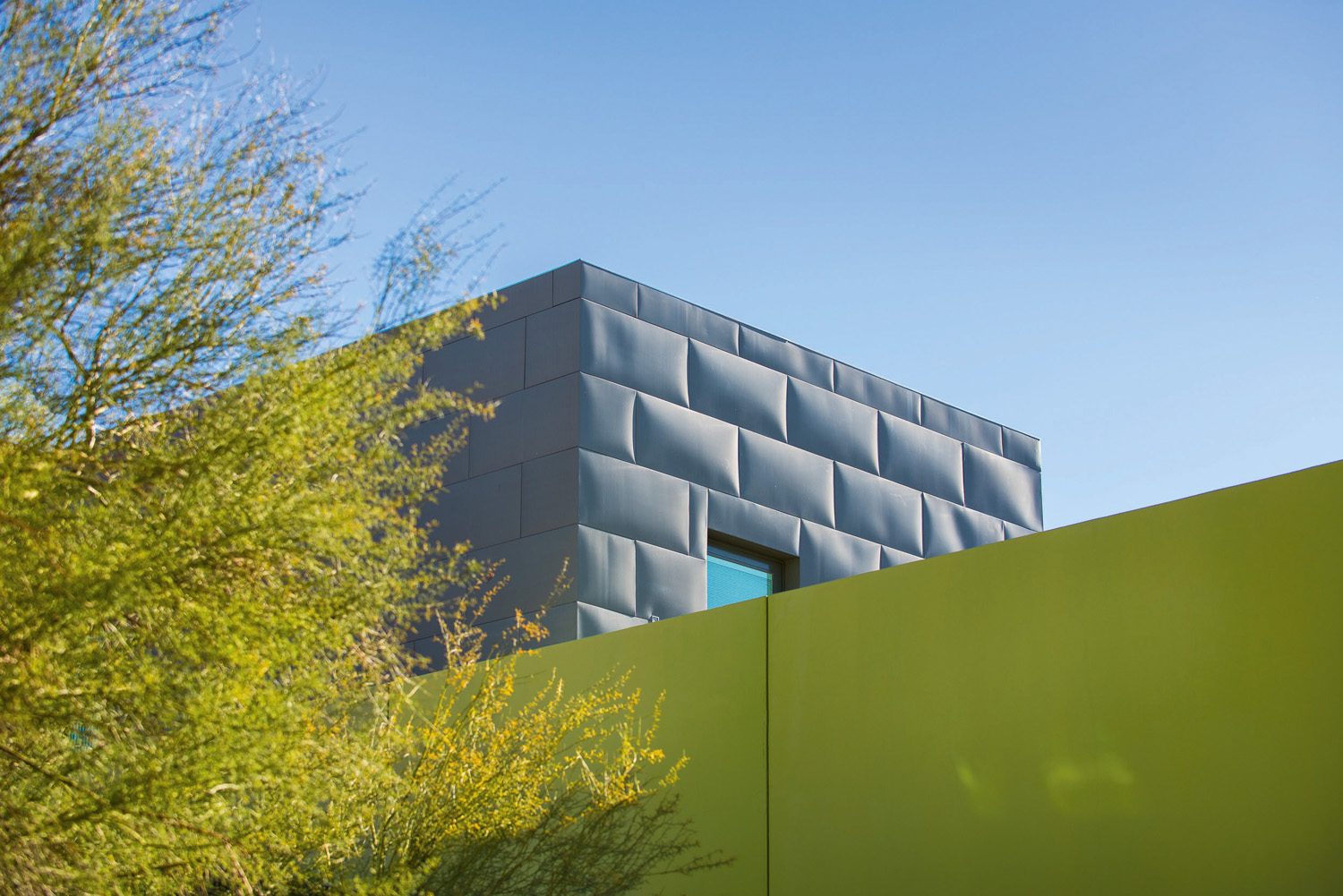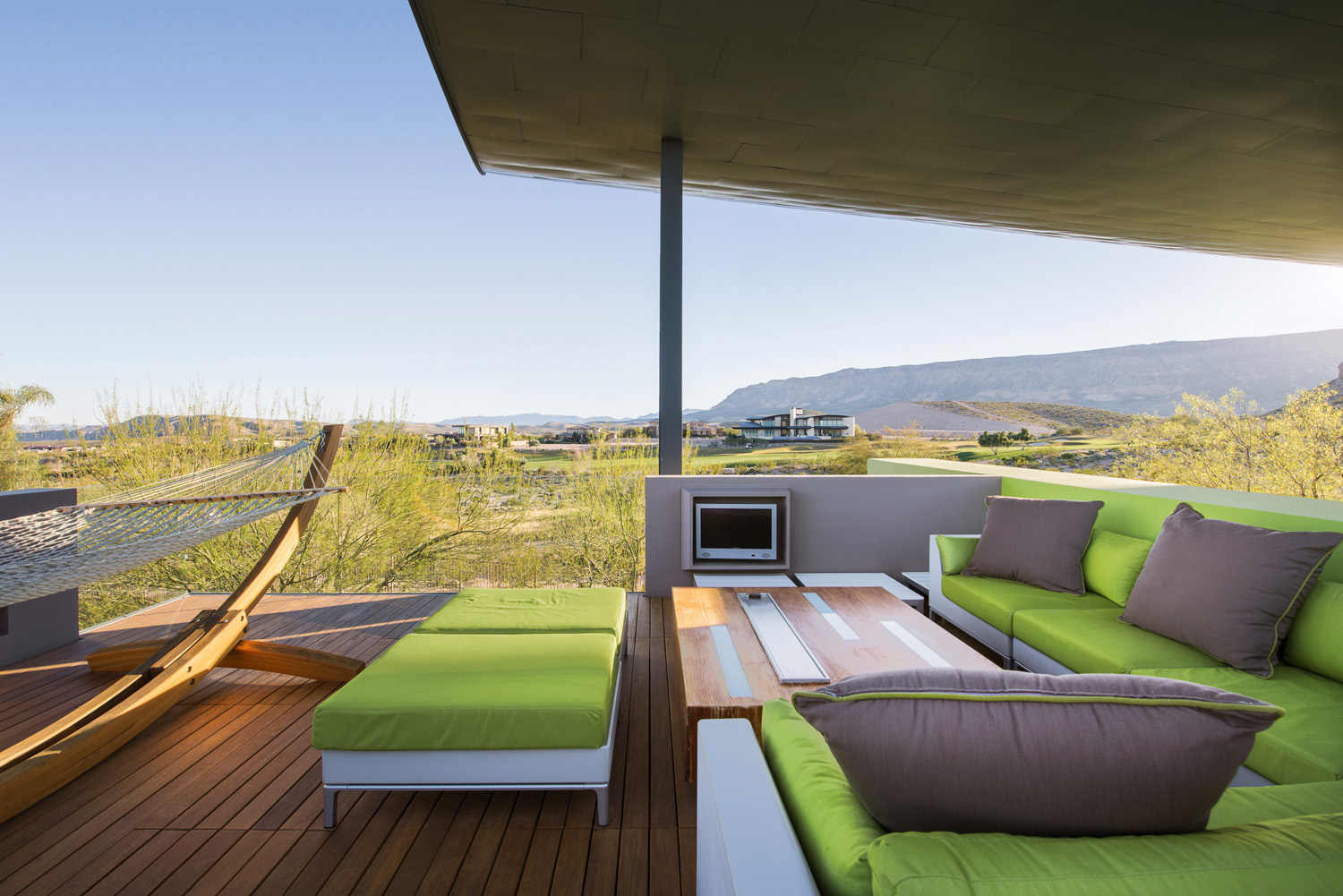 Shining the spotlight on the surrounding desert environment was important for John and Jonathan, but sustainability was also a prime consideration and had to be incorporated into the design in a big way — classic Vegas style. “We sought to employ elements of eco-friendly and climate-appropriate design throughout our home,” says John. The nine-bedroom property is surrounded by a one-of-a-kind 24-foot-high rammed-earth wall that is the first of its kind in Vegas and was created using traditional adobe construction methods. Electricity is also taken care of with a 10-kilovolt photovoltaic system harnessing the sun’s energy to offset one-third of the home’s electricity needs.